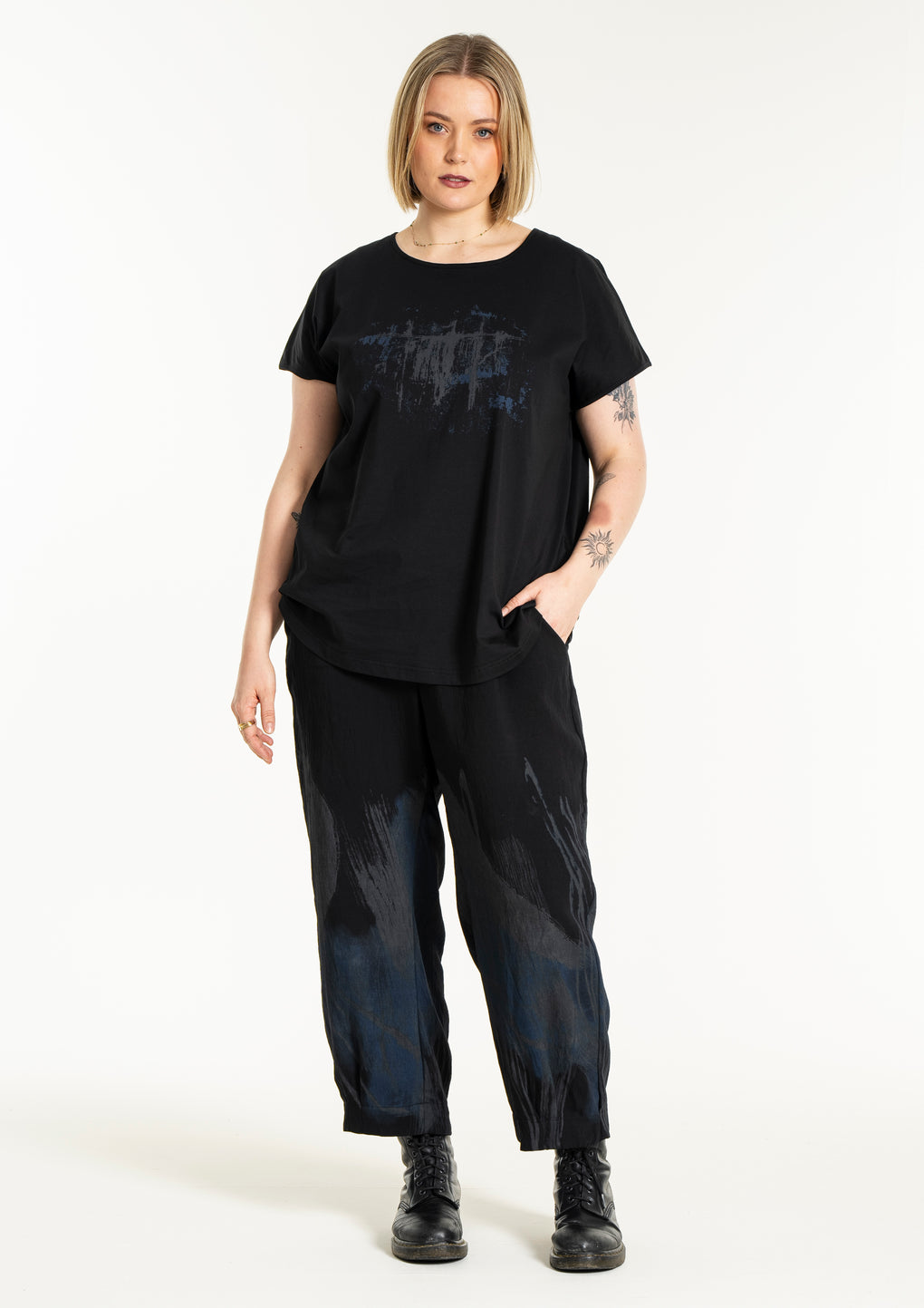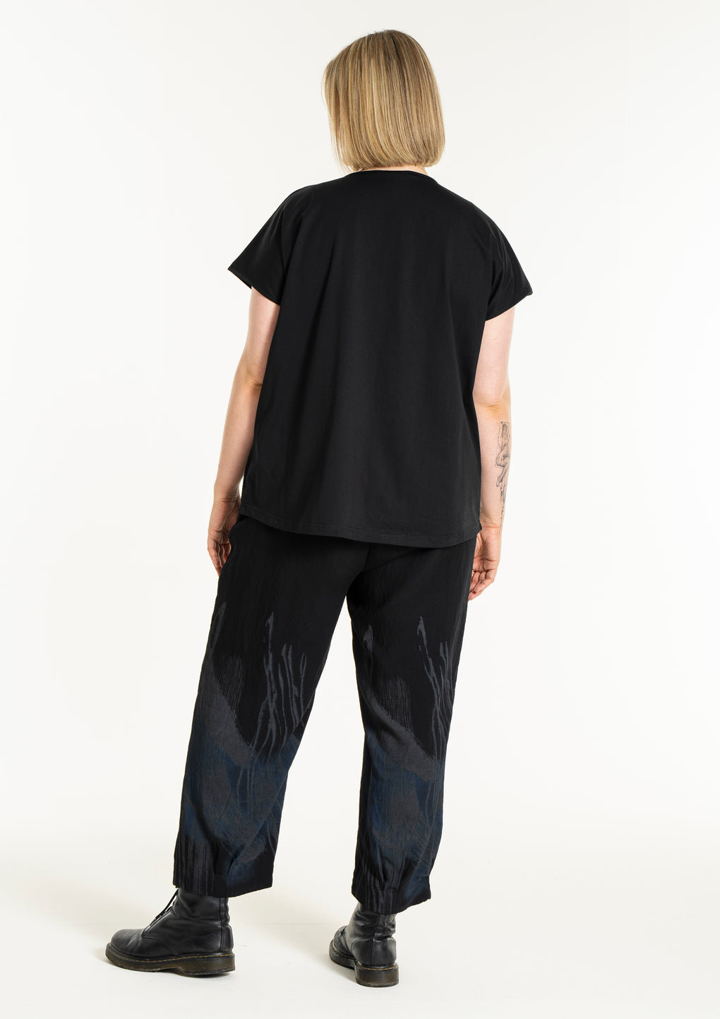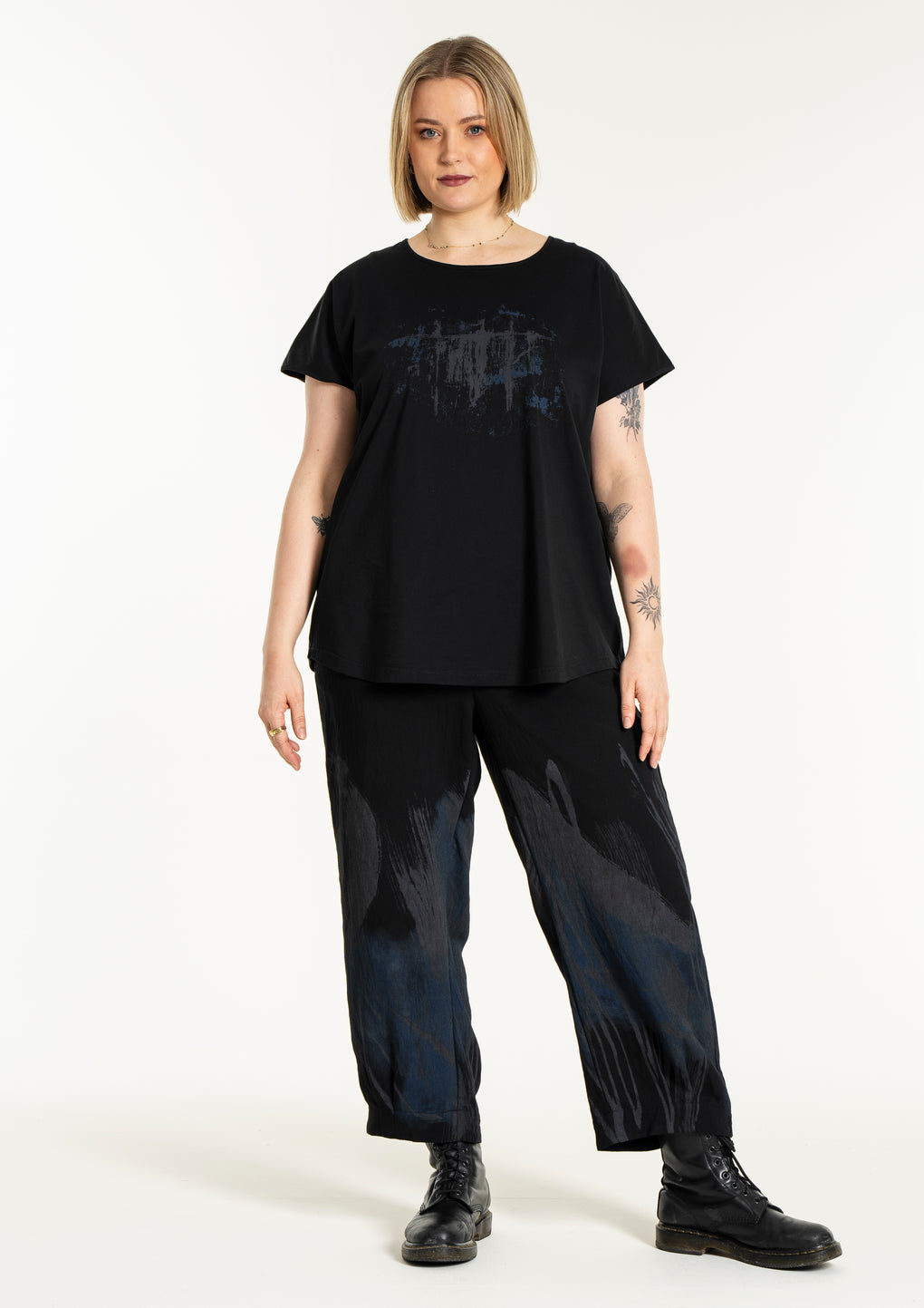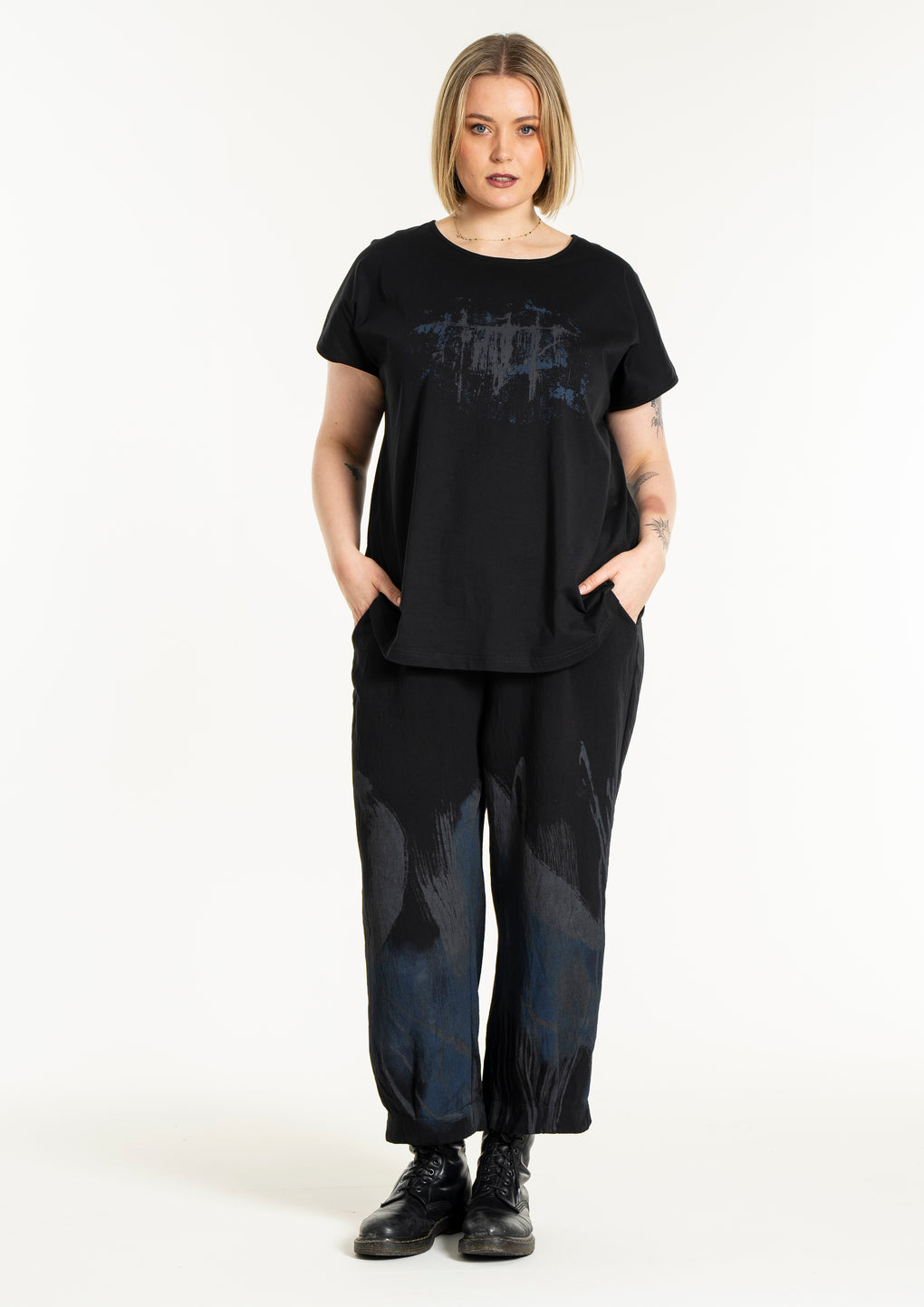 Sprek bukse med strikk i livet og 7/8 dels ben. Lommer på sidene og fint print nedover bena.