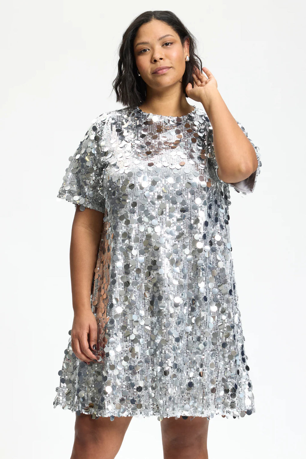 BLING, BLING. Nydelig paljettkjole med rund hals og korte ermer. Sitter underkjole fast på kjolen. Ps. Den kan miste litt paljetter til info.