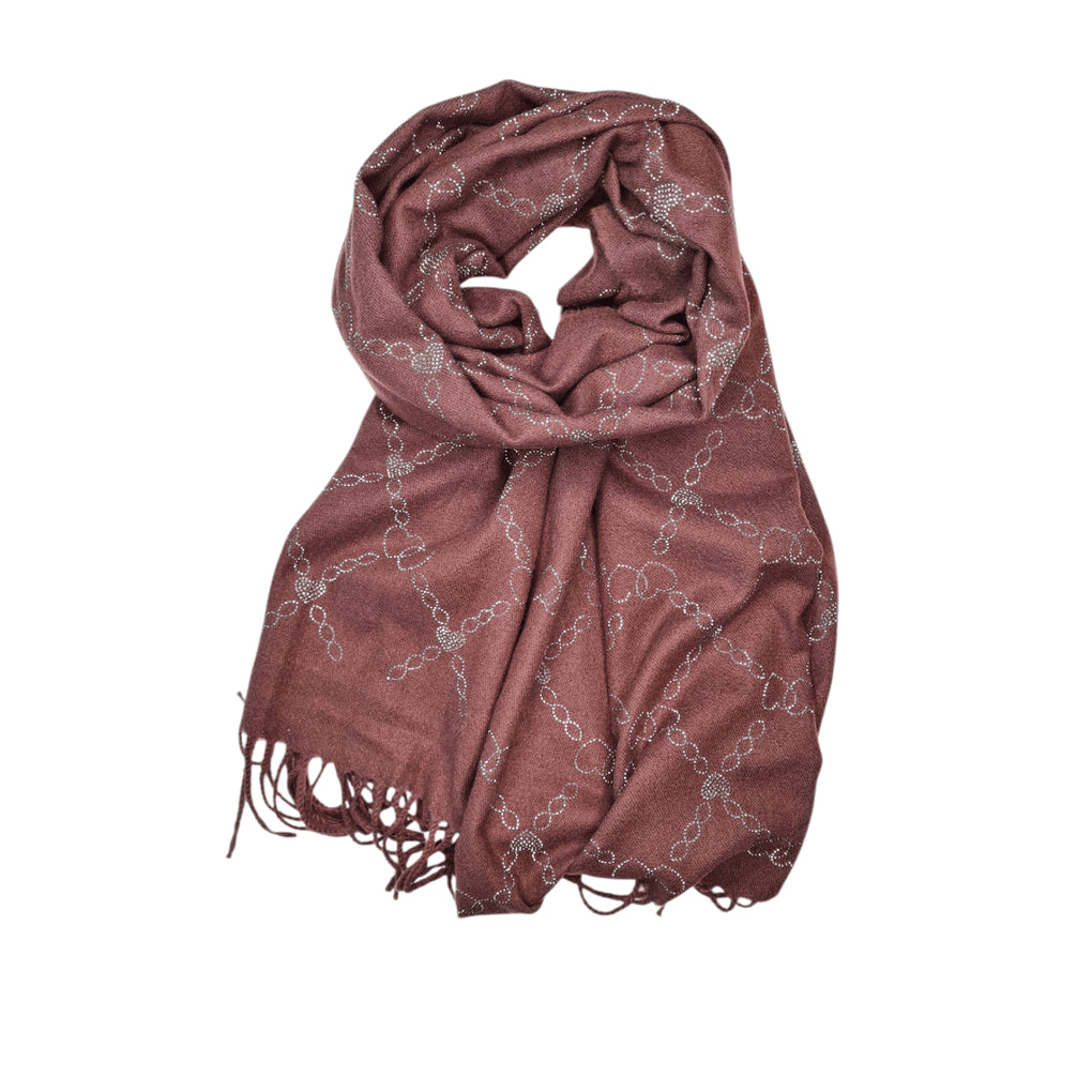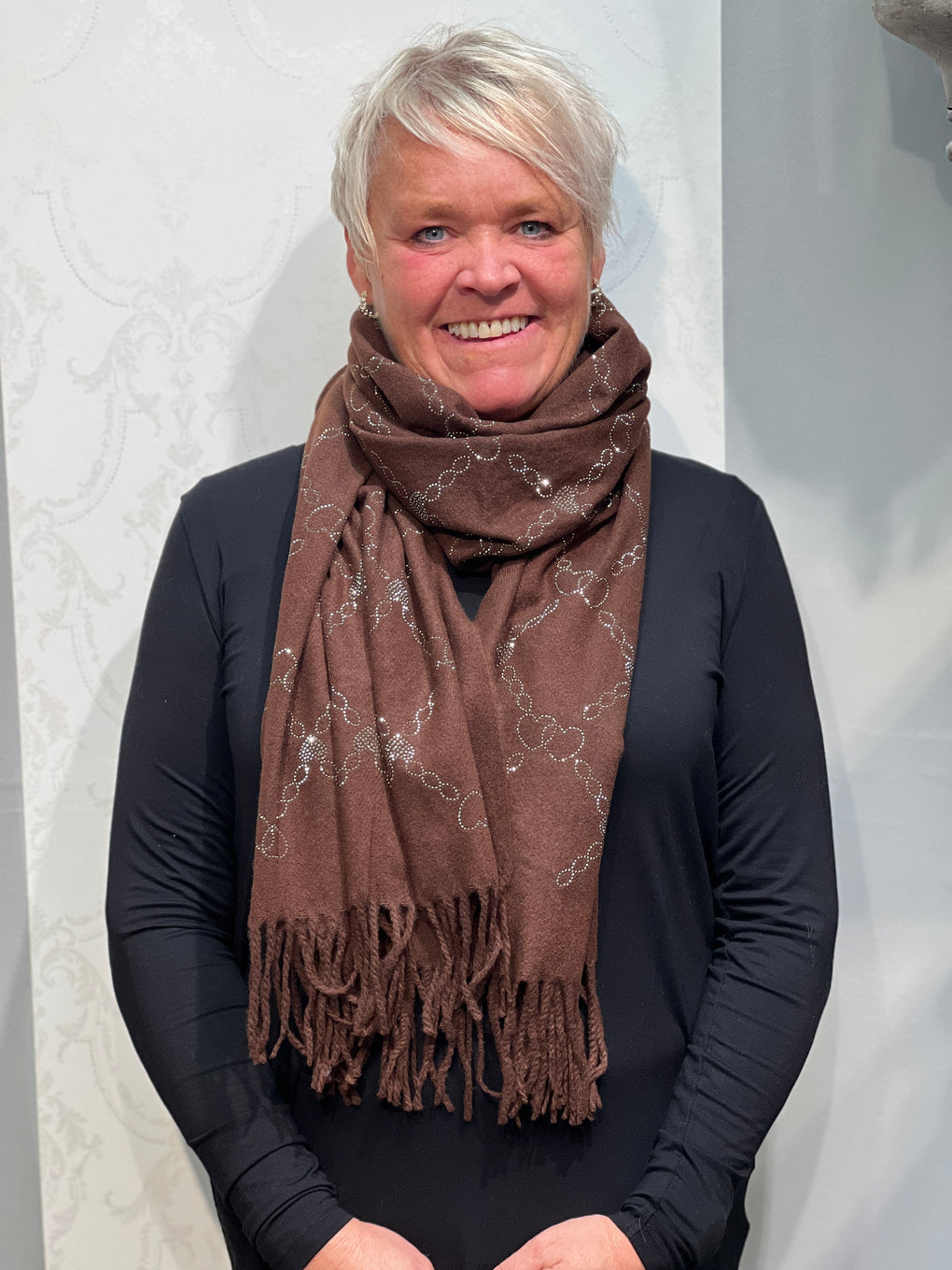 Nydelig mellomtykt og mykt skjerf med frynser. Søte stener i hjerter foran og den er ensfarget bak.