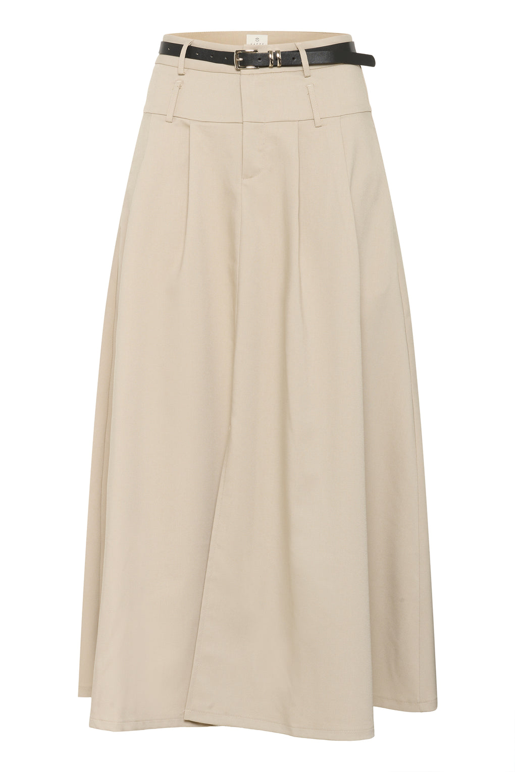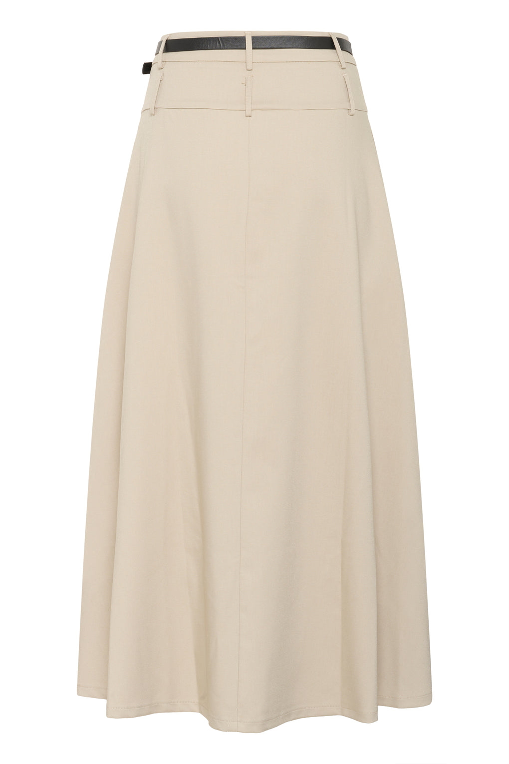 Langt A-linjeformet skjørt med mykt fall, subtil frontsplitt, strukturert linning, beltehemper og smalt belte med spenne.