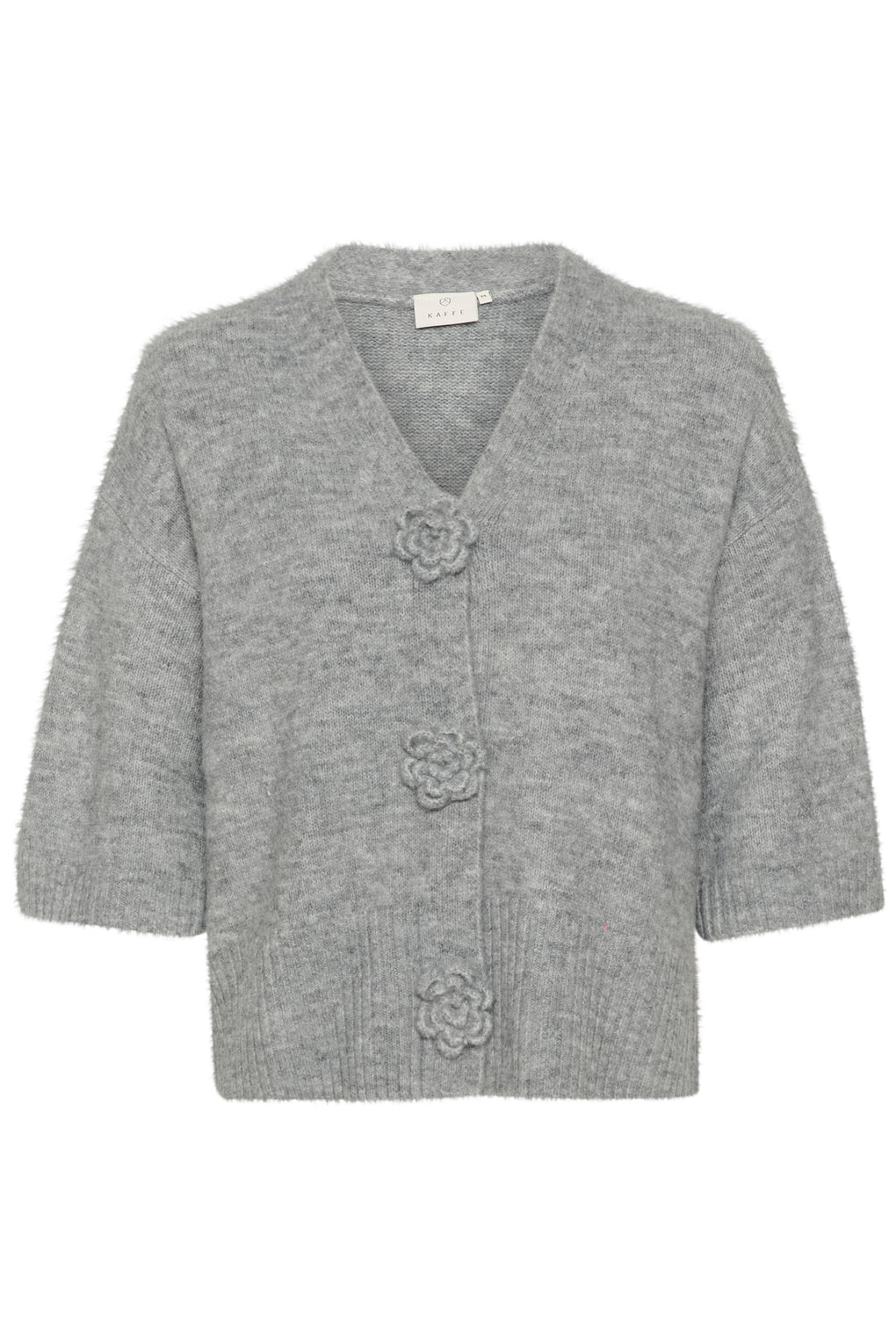 Cardigan med rett, boksete passform og cropped lengde. Mykt teksturert utseende. V-hals, blomstformede knapper og halvlange ermer preger designet.