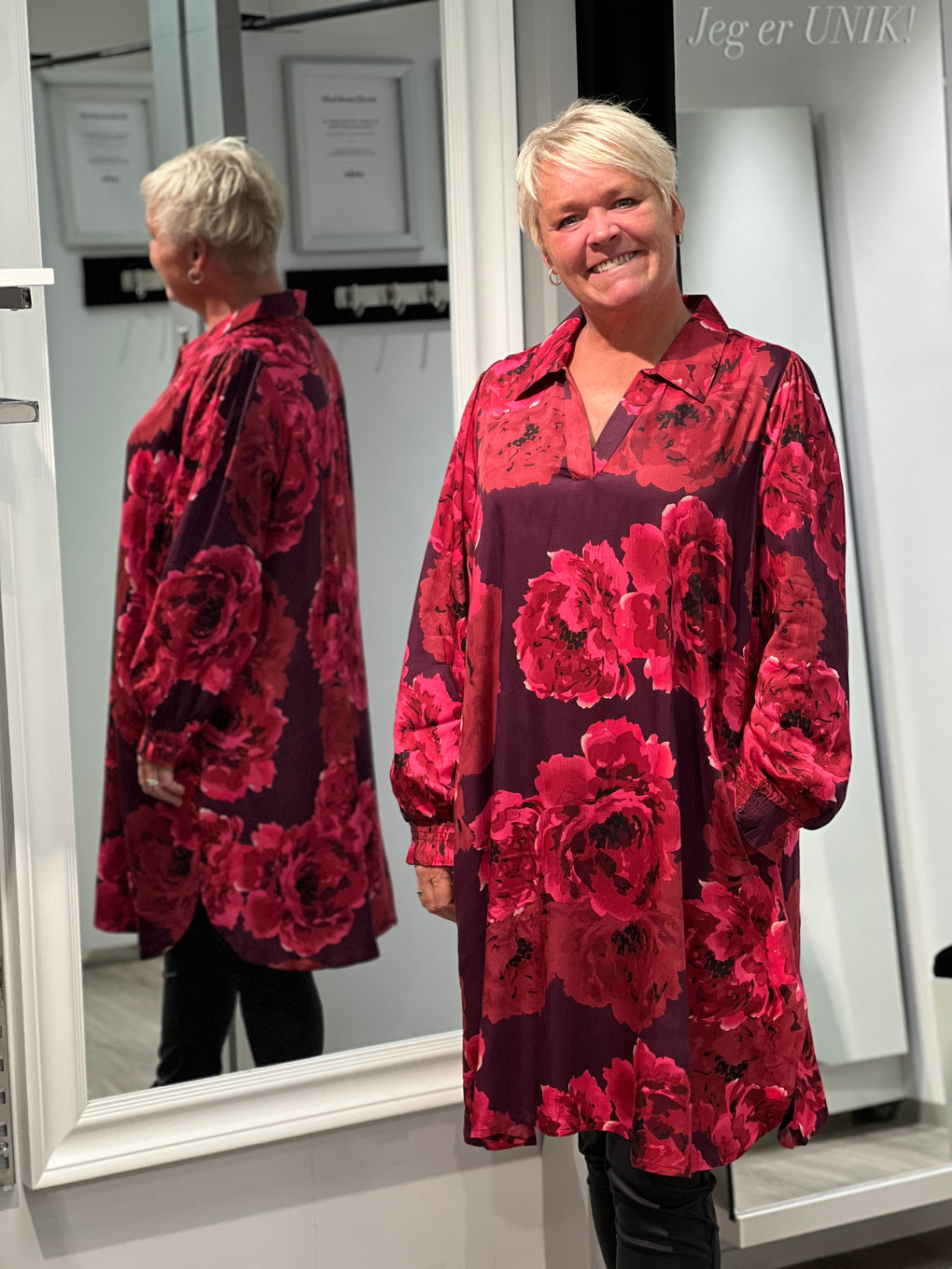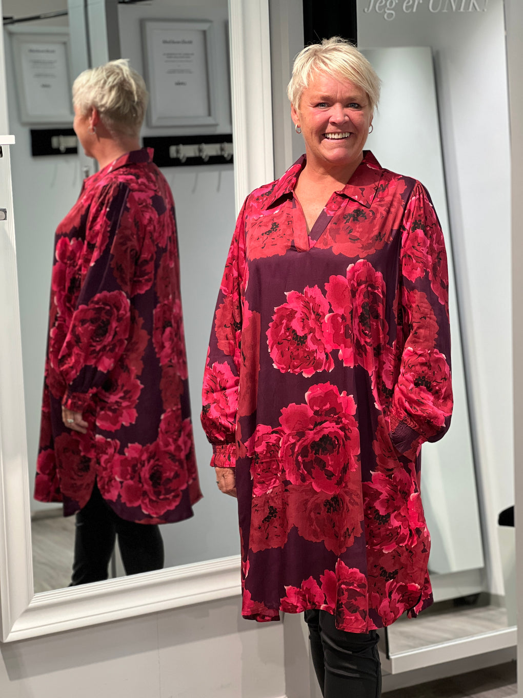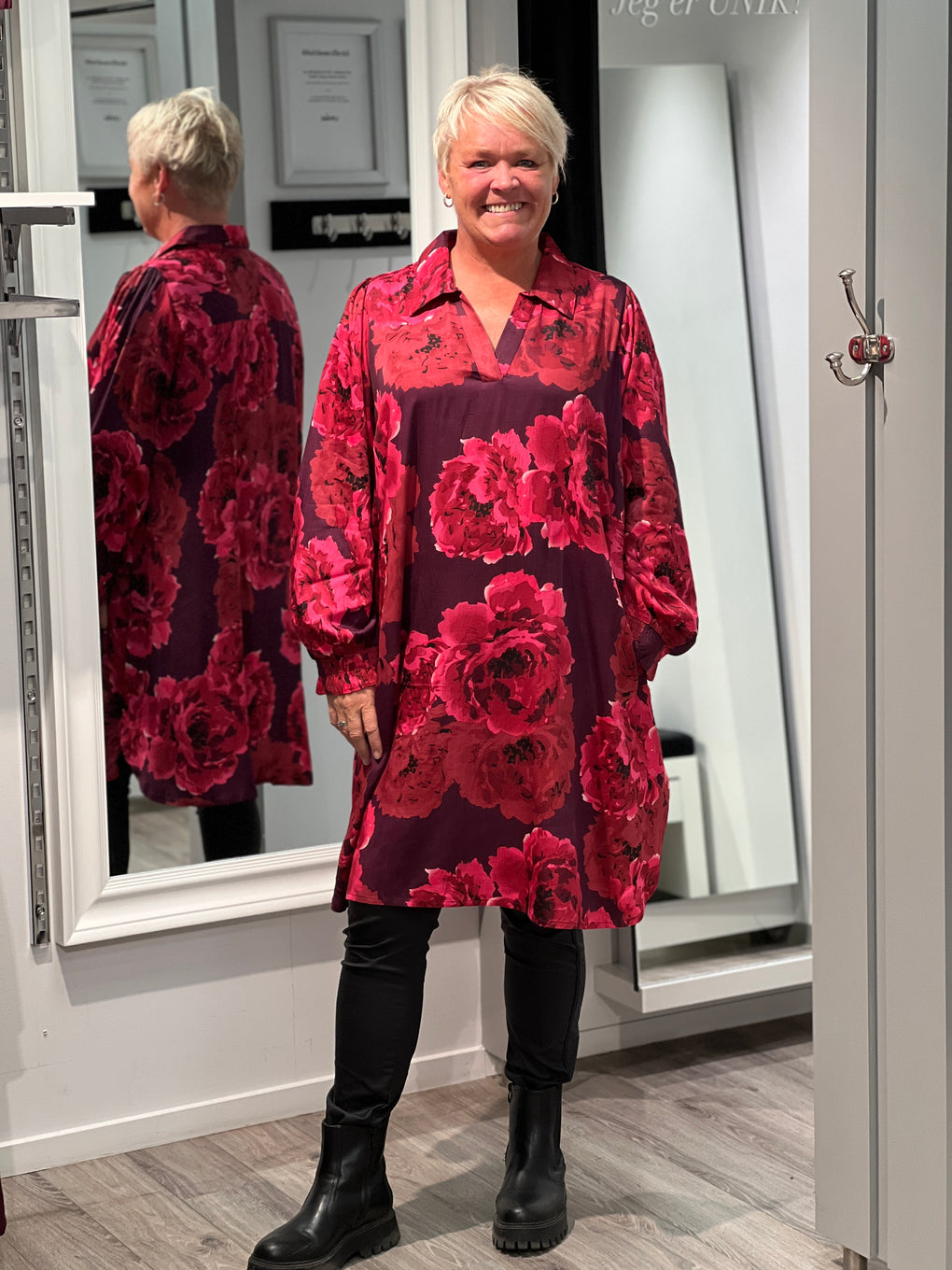 Kjole/tunika i ett nydelig print. Tunikaen har en fin krave, lommer på sidene og bred mansjett på ermene.