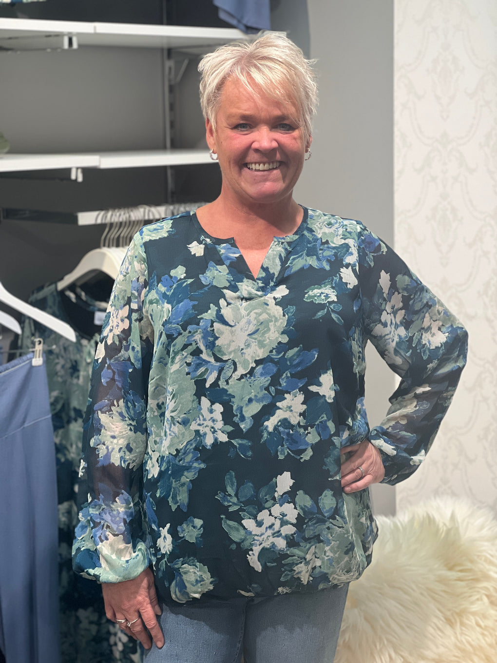 Søt bluse i en herlig fargekombinasjon. Blusen har strikk i bunnen og løs strikk ved ermene. Den har en fin v-hals og 3/4 ermer.