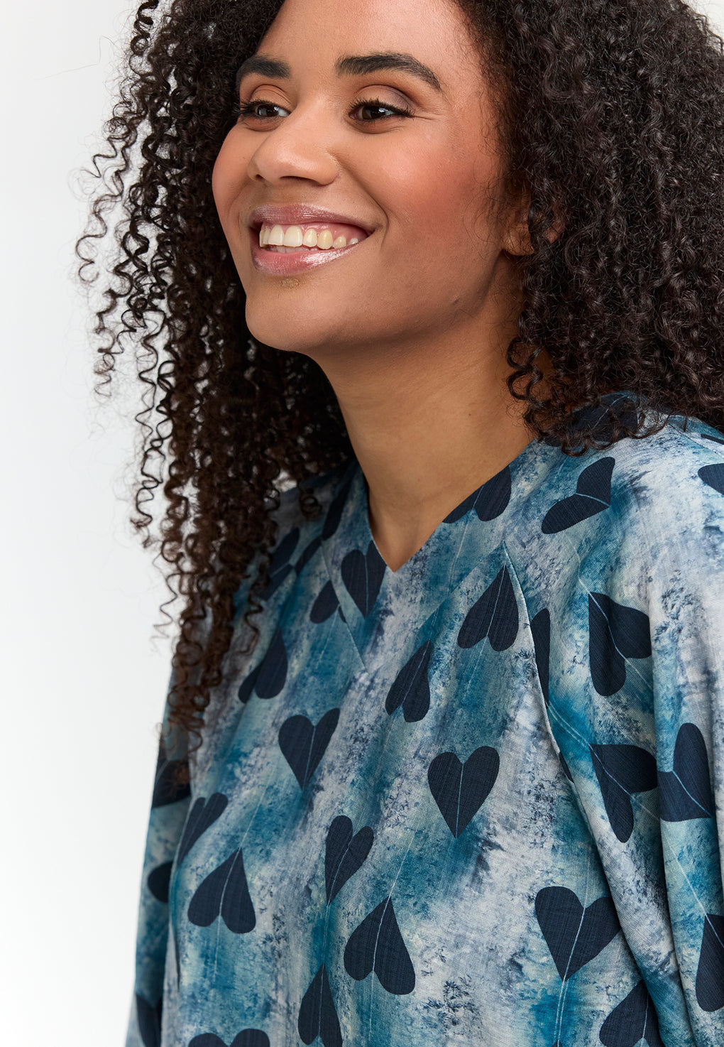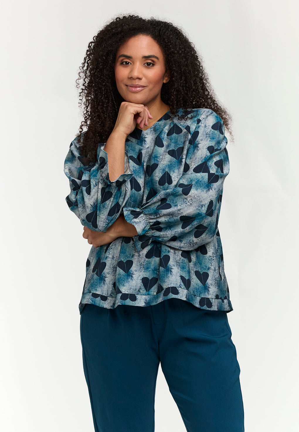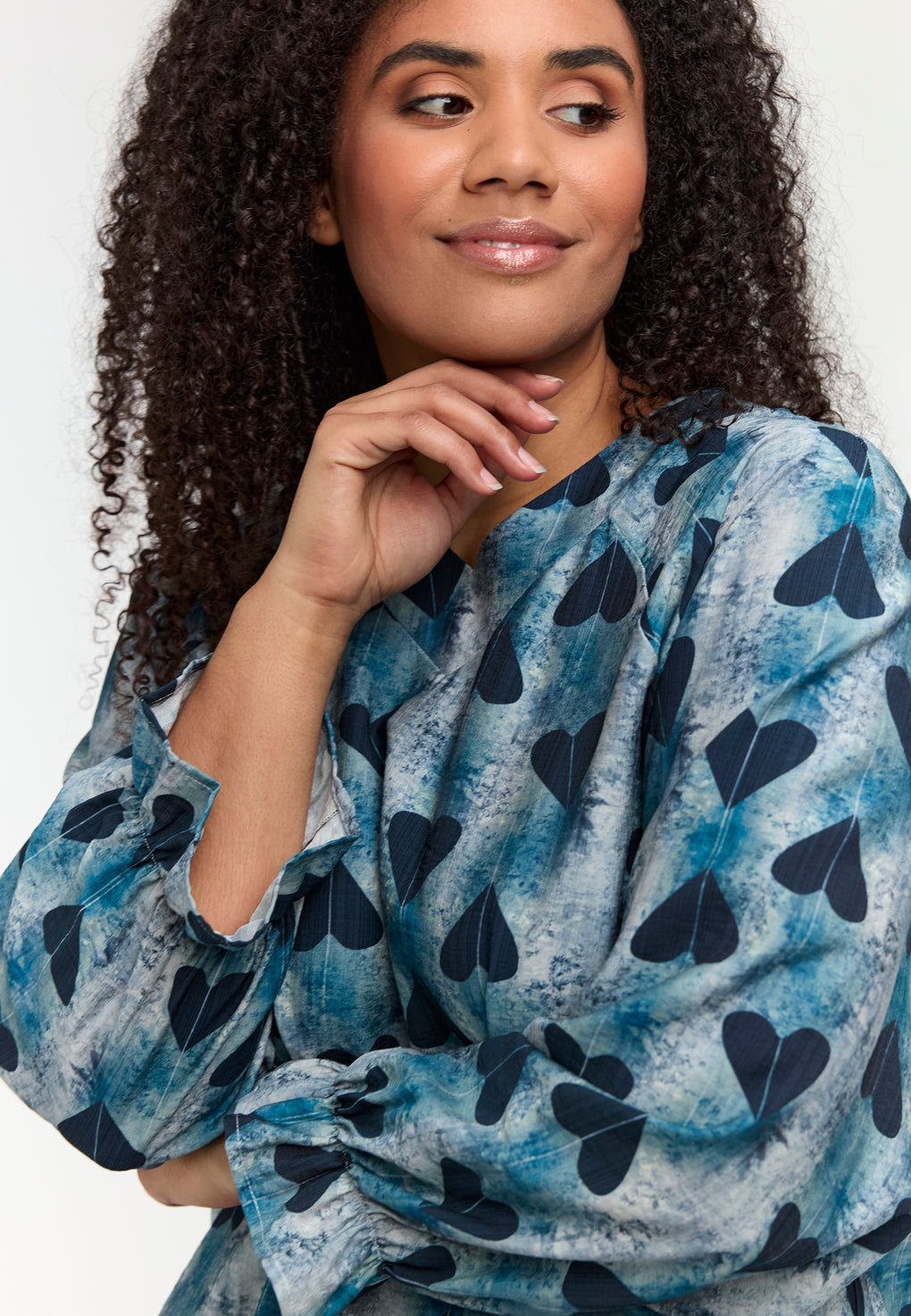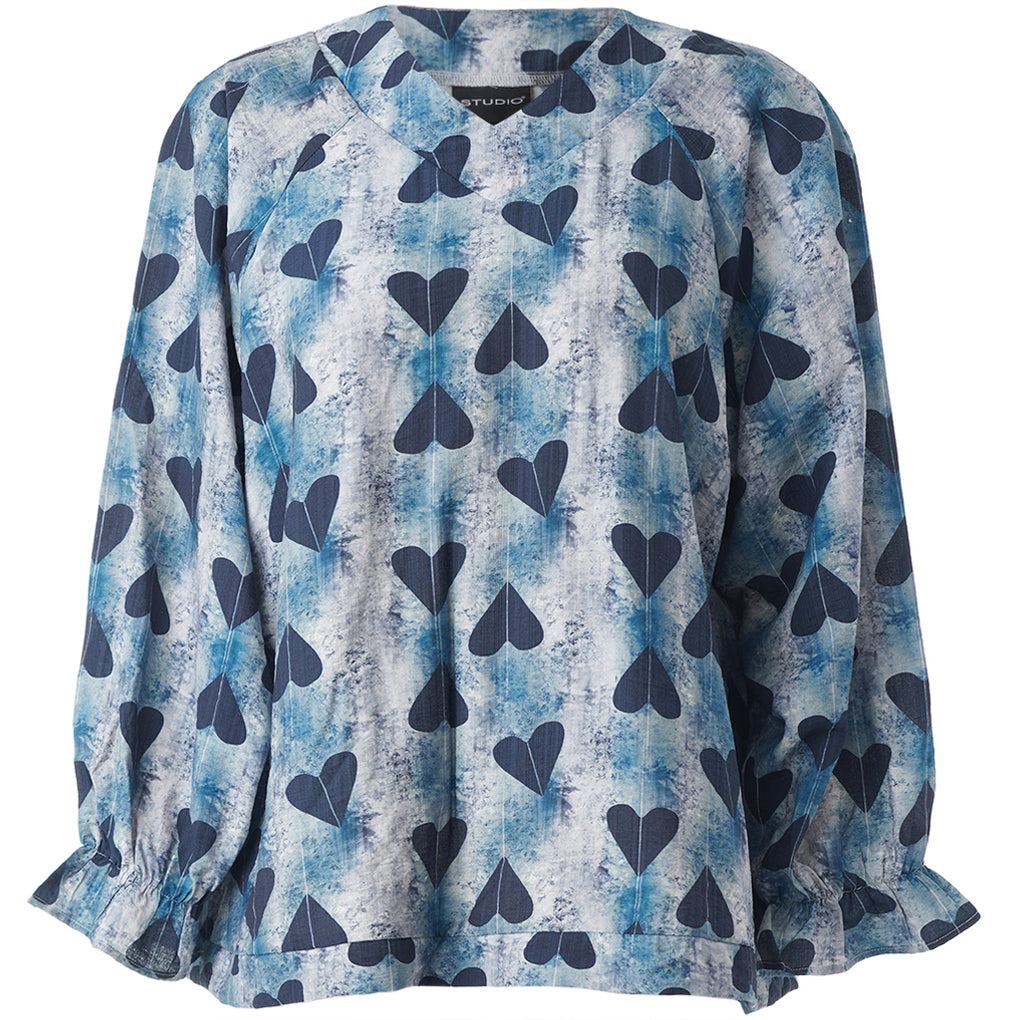 Supersøt bluse i ett nydelig print. V-hals og lange ermer med løs strikk nede.