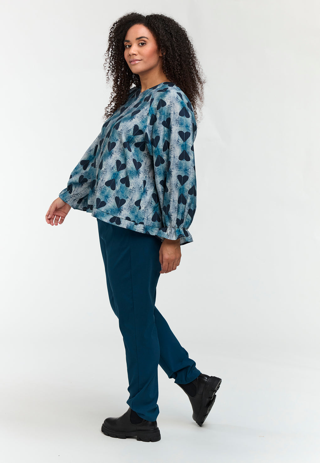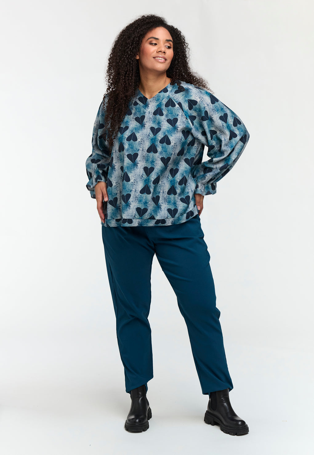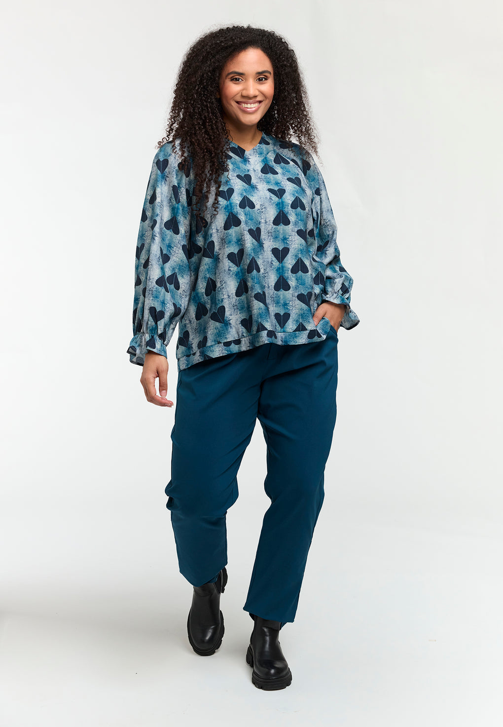 Supersøt bluse i ett nydelig print. V-hals og lange ermer med løs strikk nede.