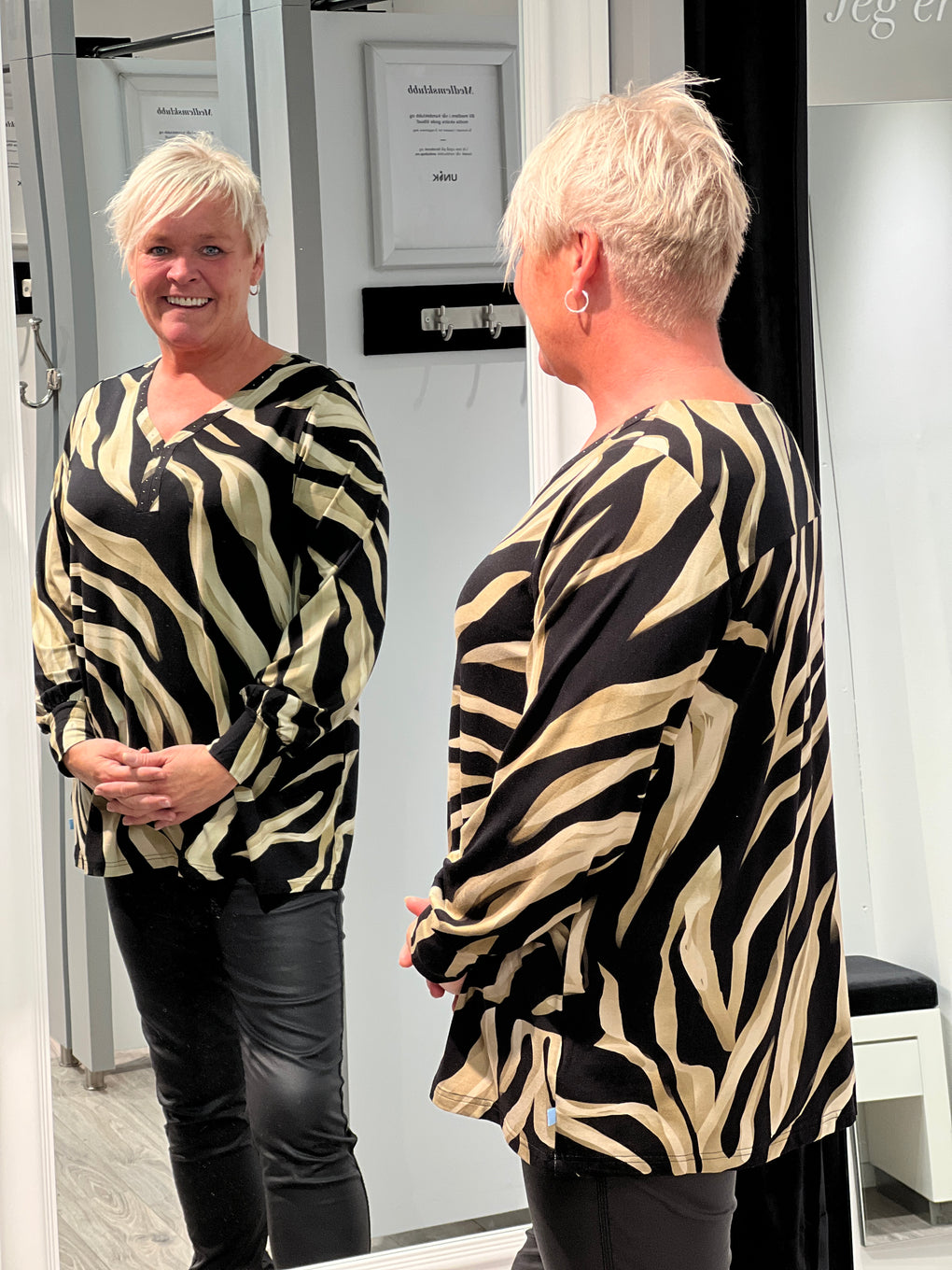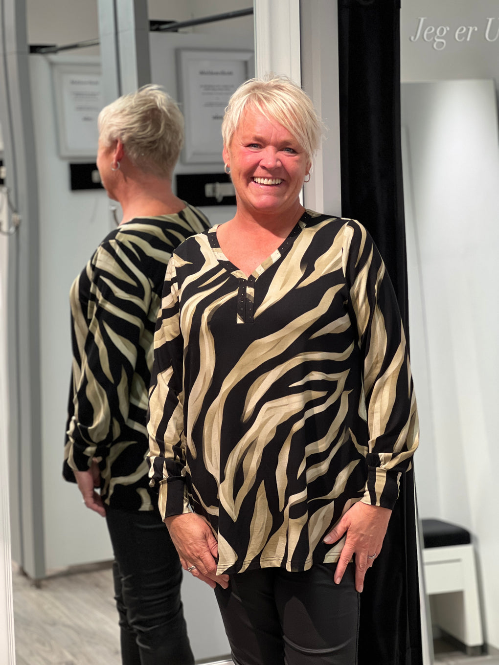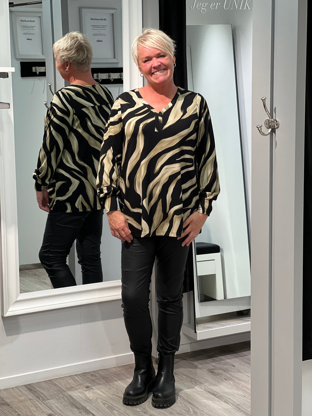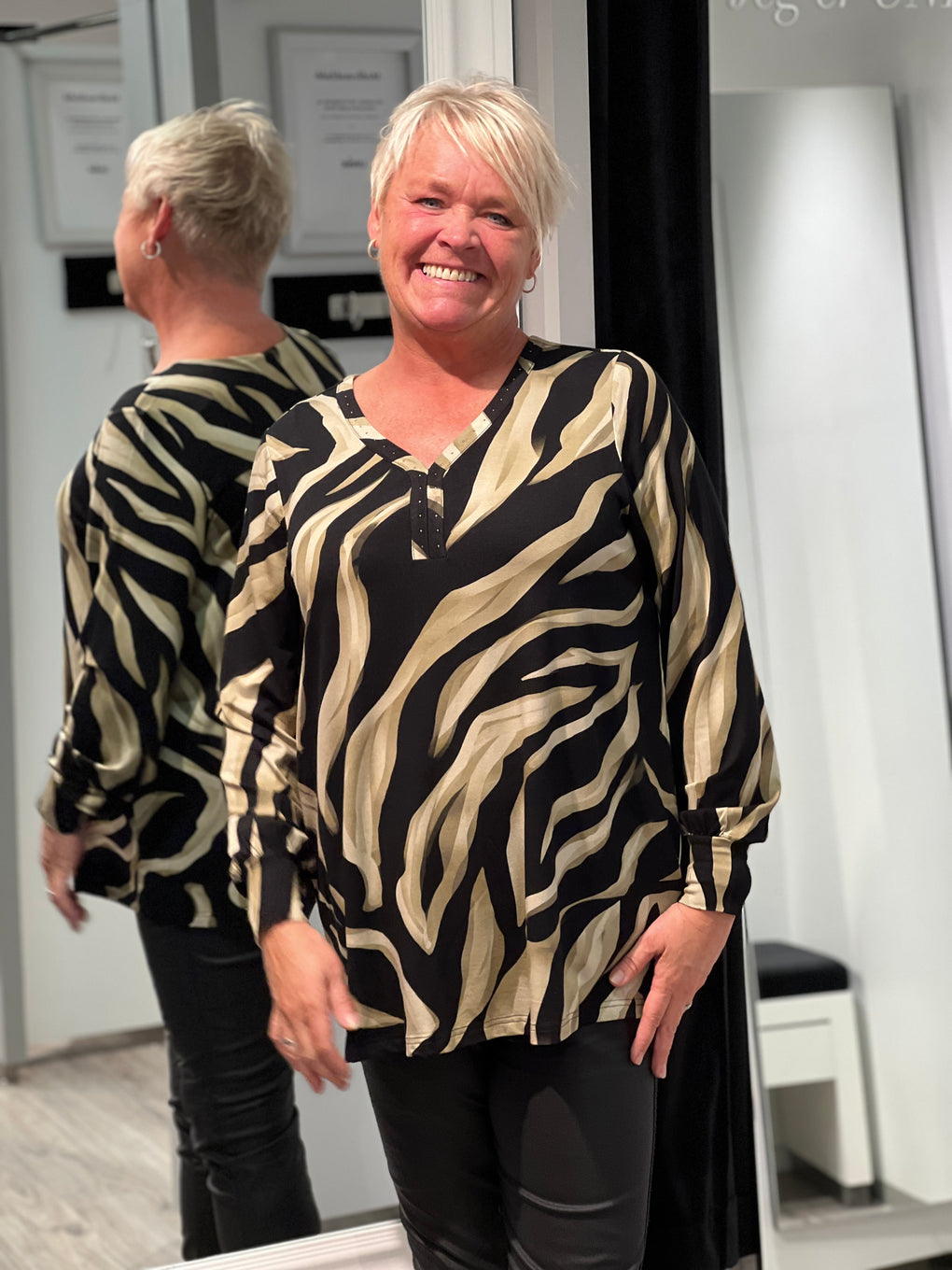 Nydelig bluse i dyreprint. Den har v-hals med små søte sorte stener og bred mansjett på ermene.