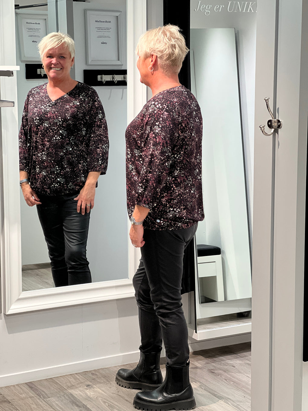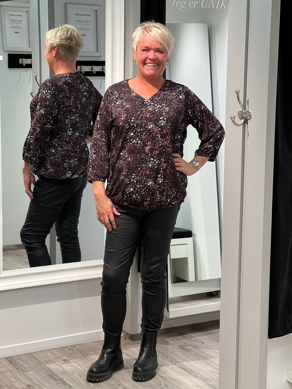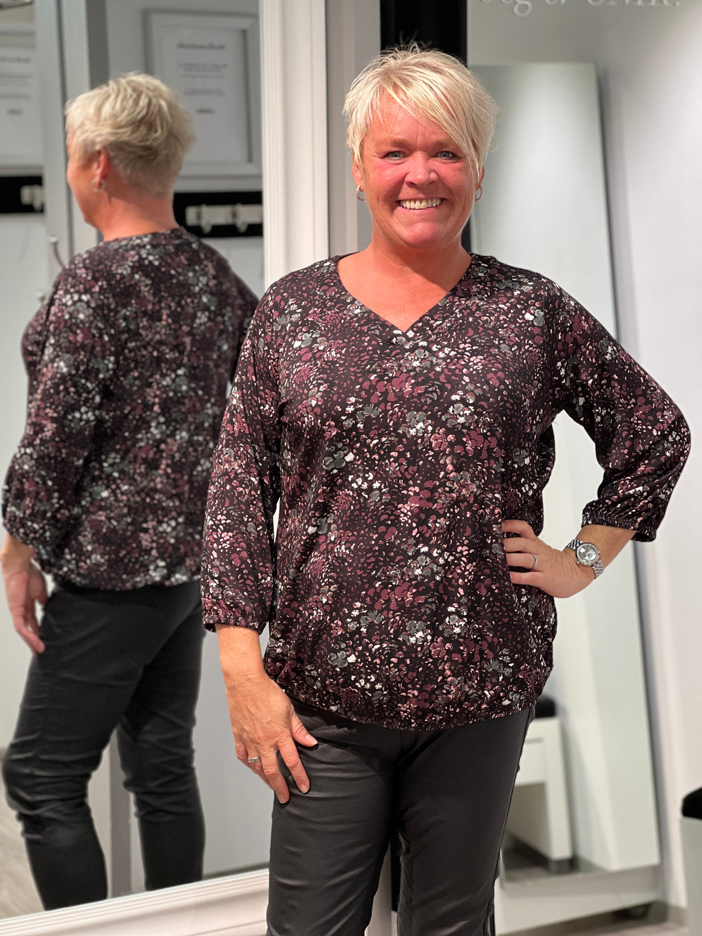 Søt topp i ett nydelig print. Toppen er i tung viskose og faller fint på kroppen. V-hals og 3/4 dels ermer. Strikk i bunnen på blusen og på ermene.