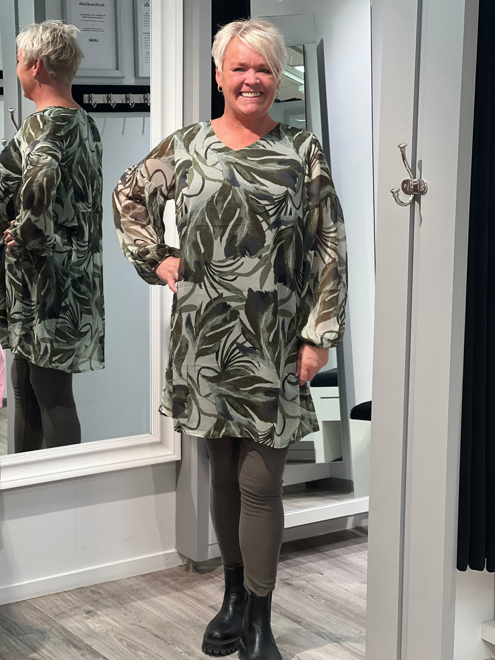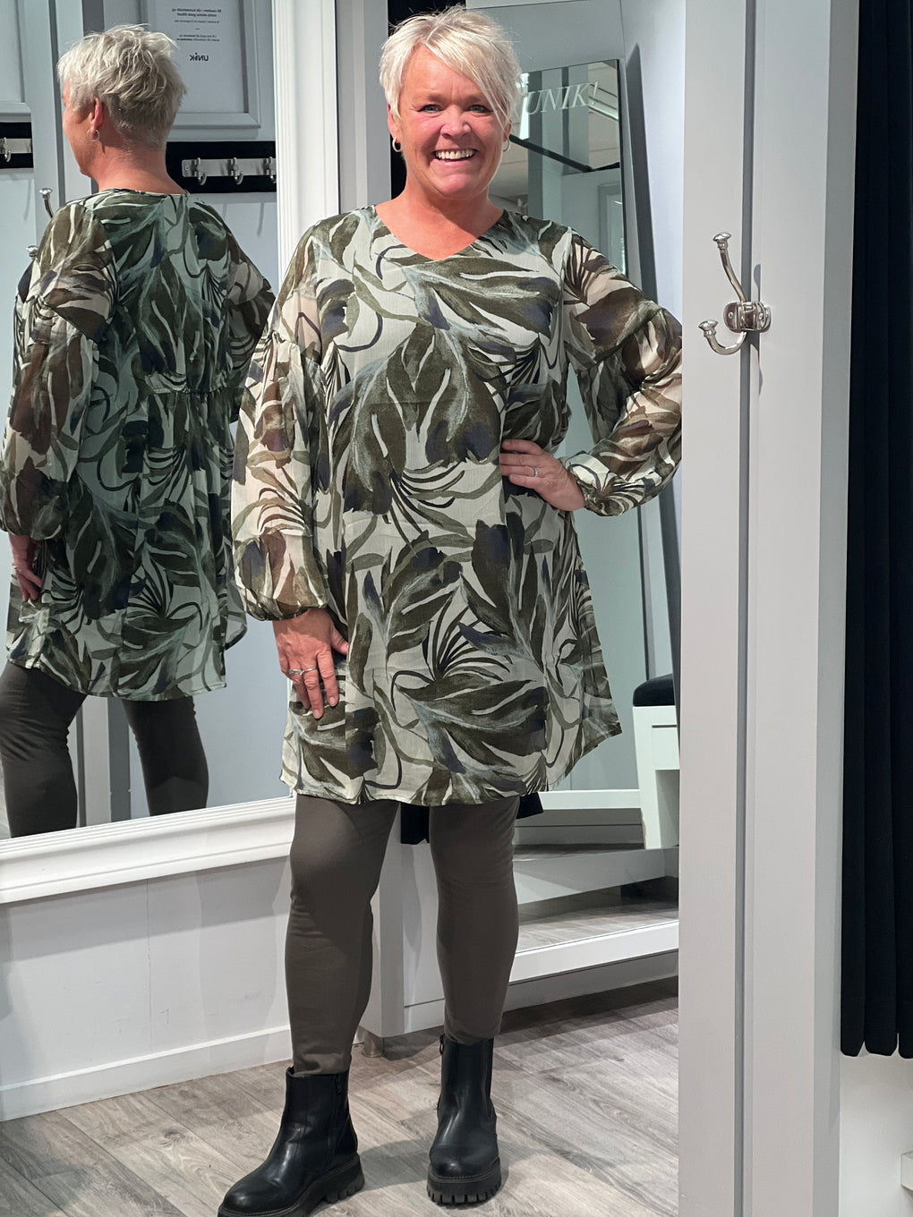 Supersøt tunika med v-hals. Strikk på ermene og i ryggen. Tunikaen er fòret med viskose og lett chiffong utenpå.