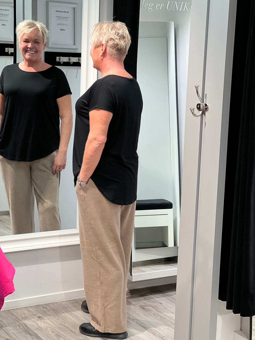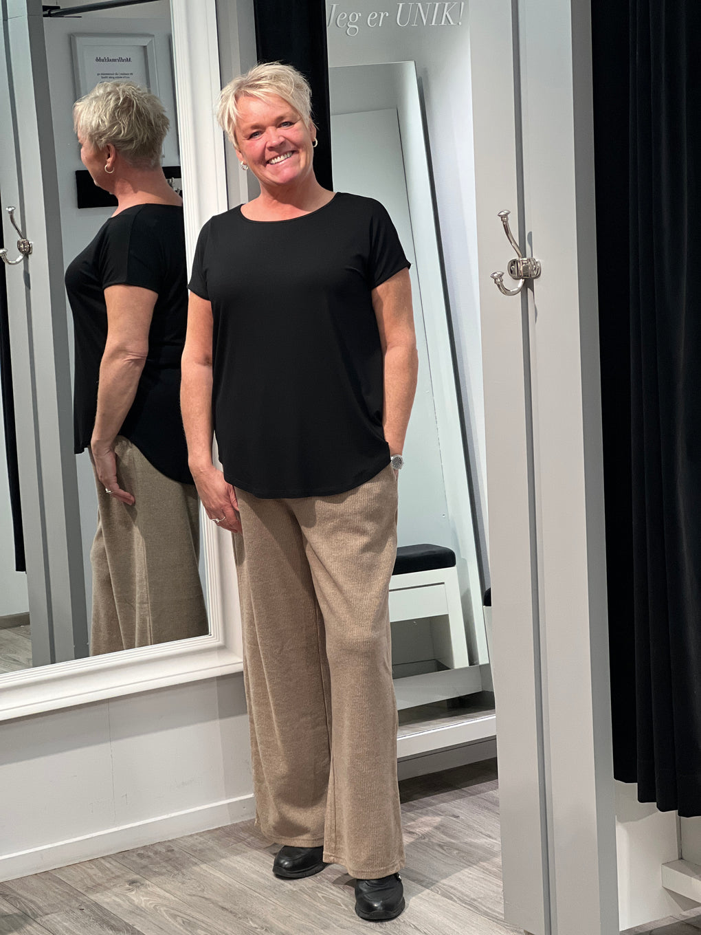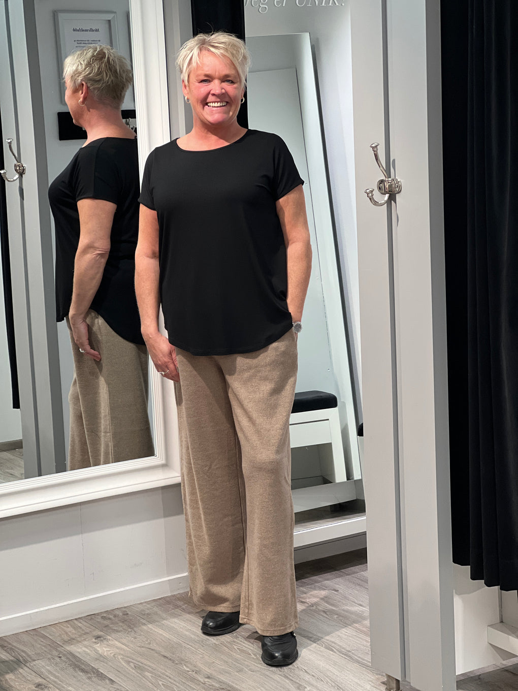 Supergod bukse i deilig babycord med vide ben, strikk i livet og lommer på sidene.