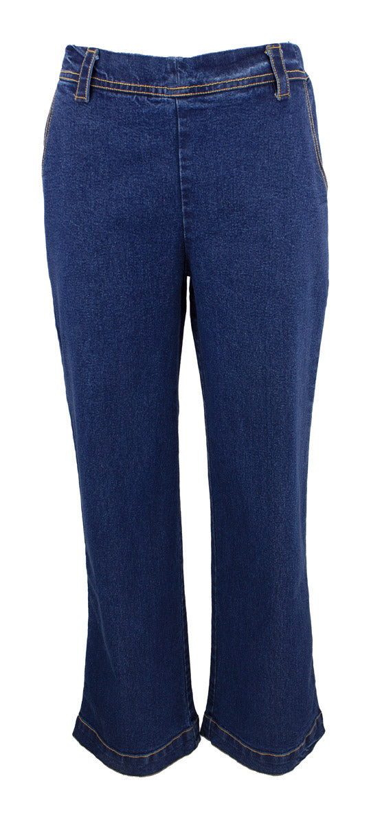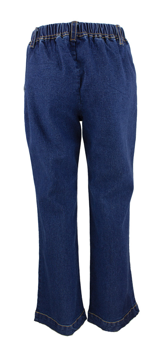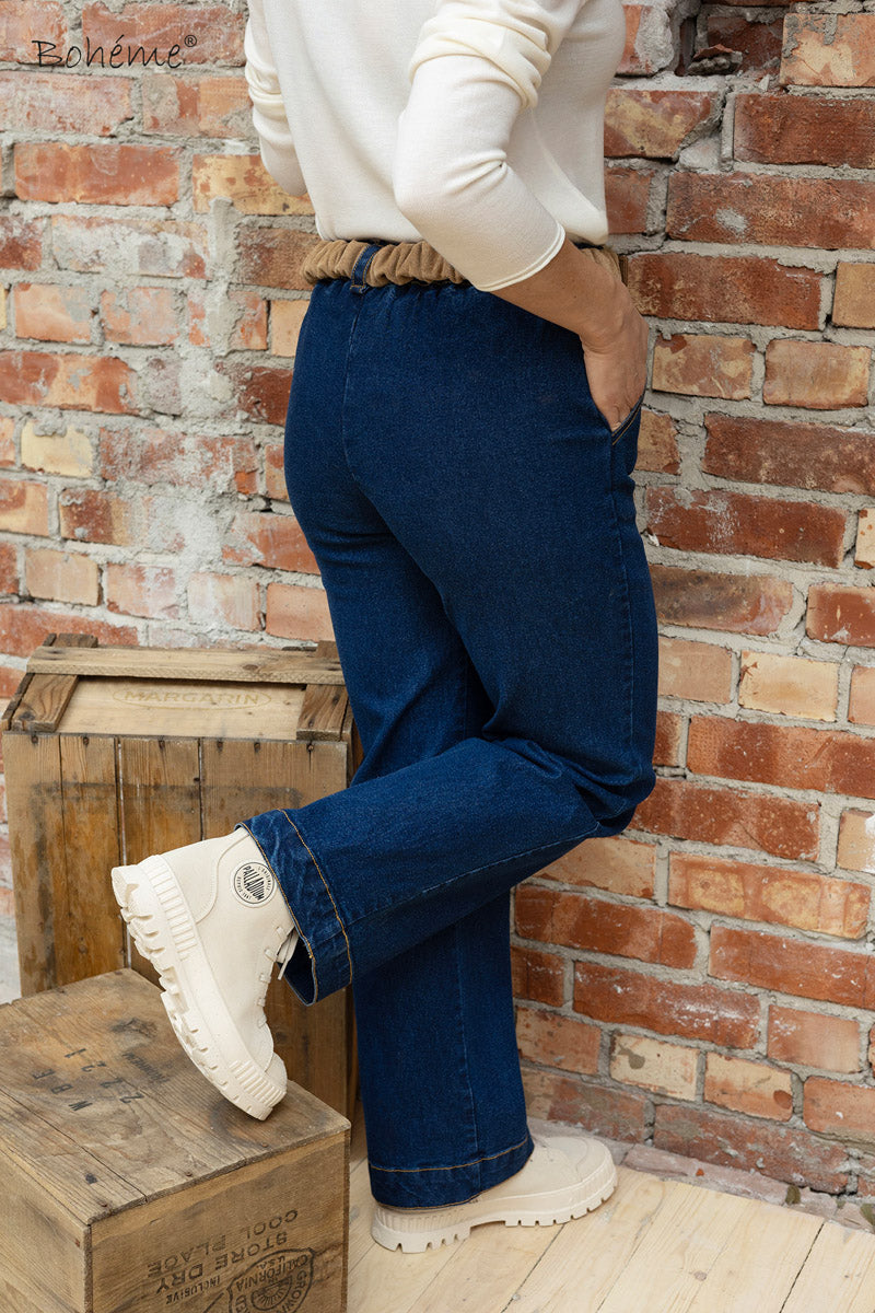 Vid og god jeans med strikk bak og beltehemper hele veien rundt. Lommer på sidene og kontrastsøm nede på bena.