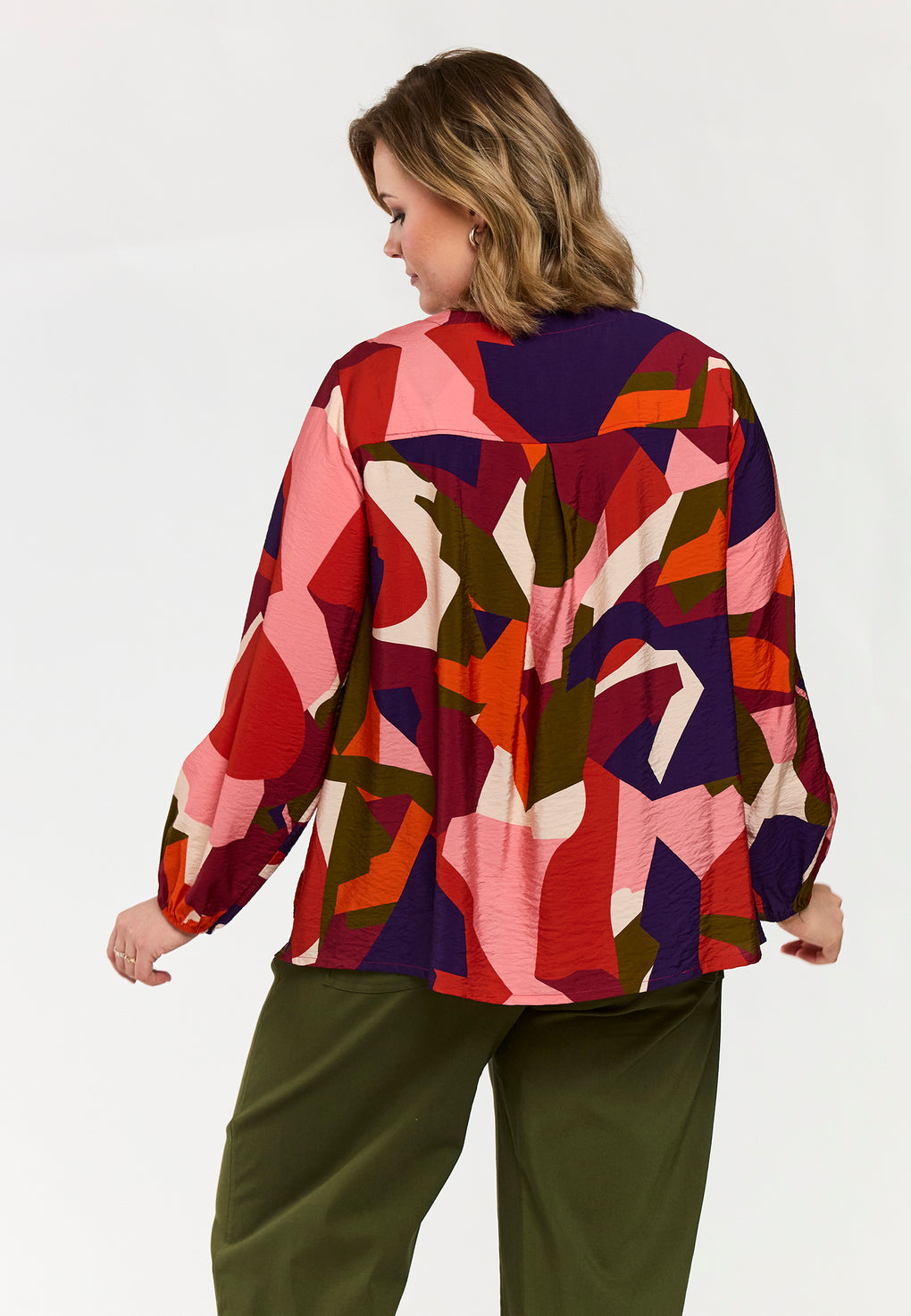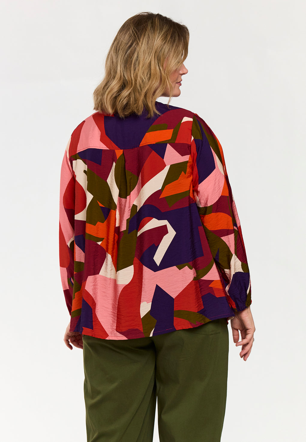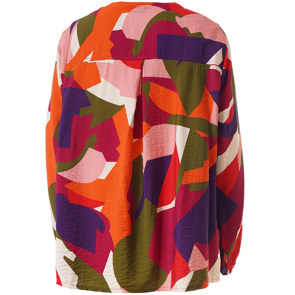 Skjorte/bluse i ett fargerikt print. Rund hals og knappestolpe hele veien foran. Løs strikk på ermene og blusen har ett fint fall bak.