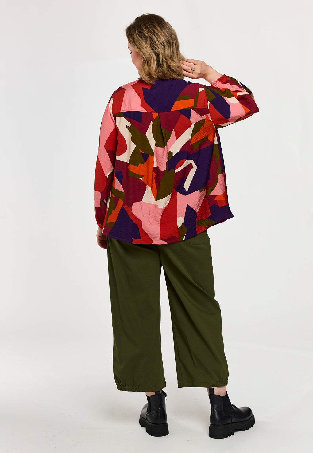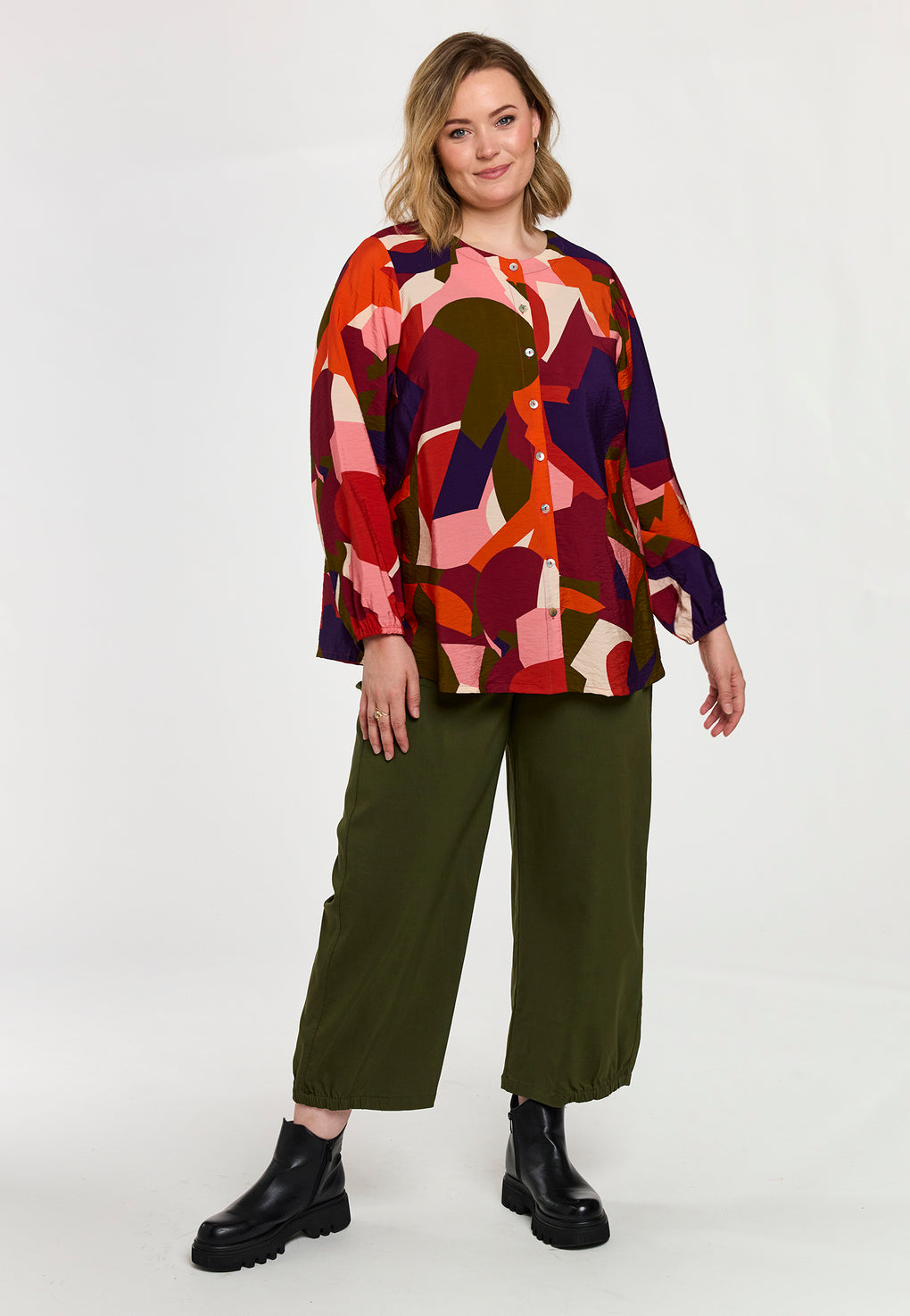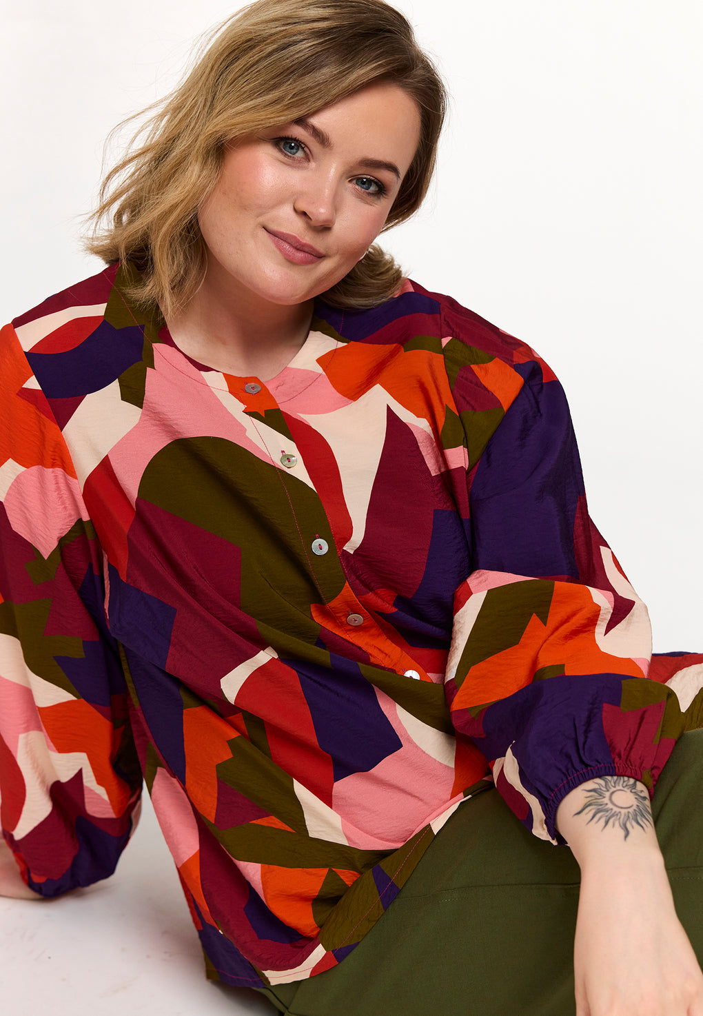 Skjorte/bluse i ett fargerikt print. Rund hals og knappestolpe hele veien foran. Løs strikk på ermene og blusen har ett fint fall bak.
