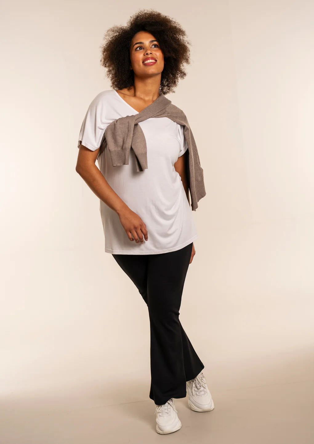 Lekker bootcut med god stretch og strikk i livet. Den er utrolig myk og behagelig på. Høy og god på livet. Krymper litt i bena etter vask.