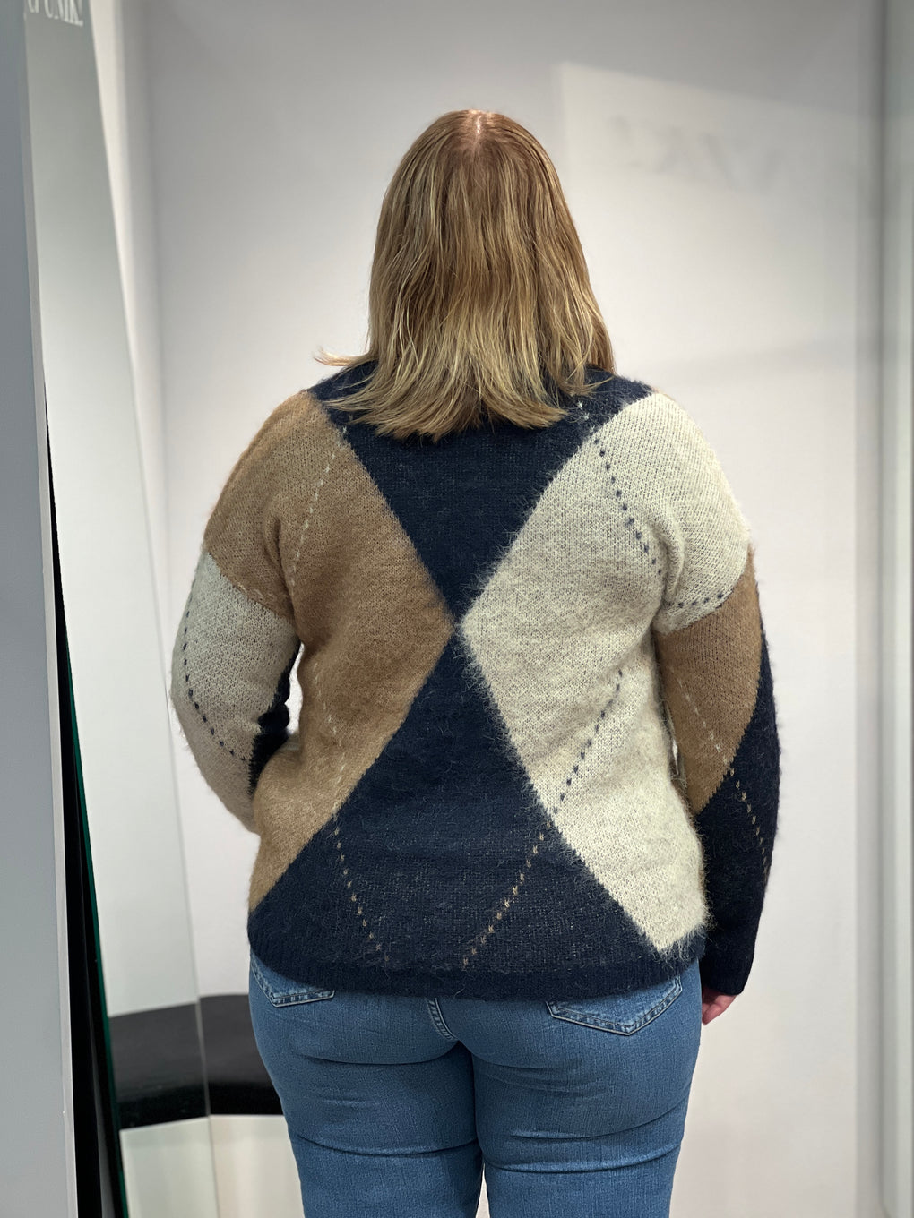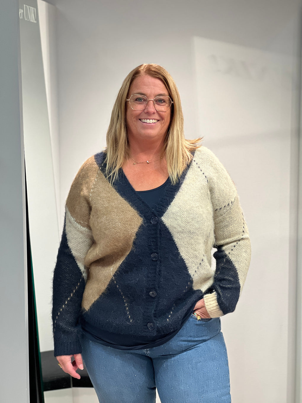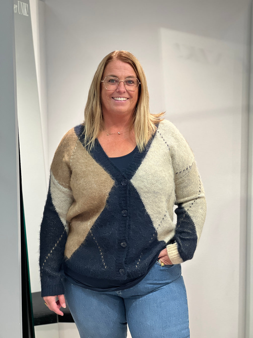 Cardigan i fin fargekombinasjon. Den har v-hals og knappestolpe foran.