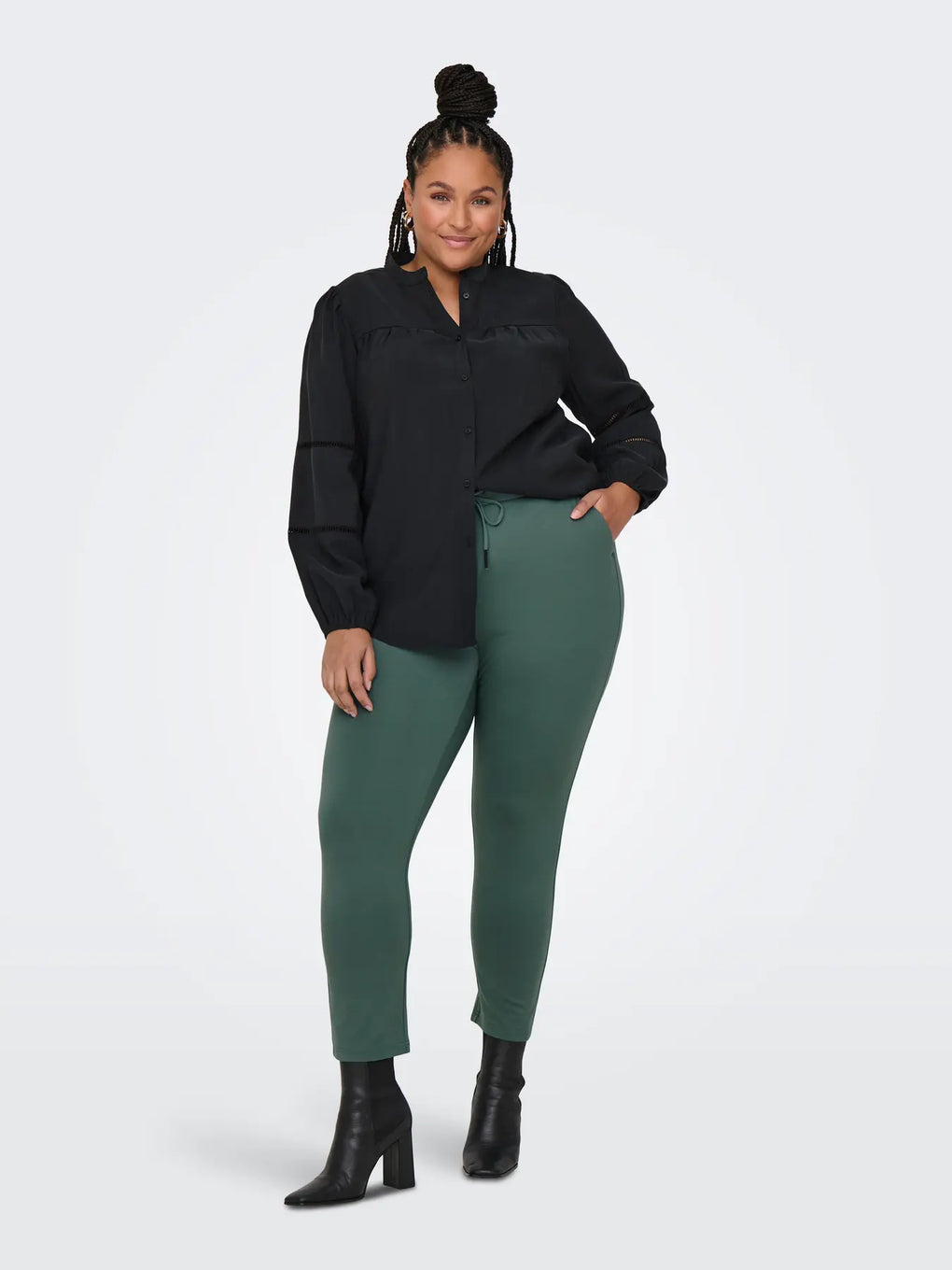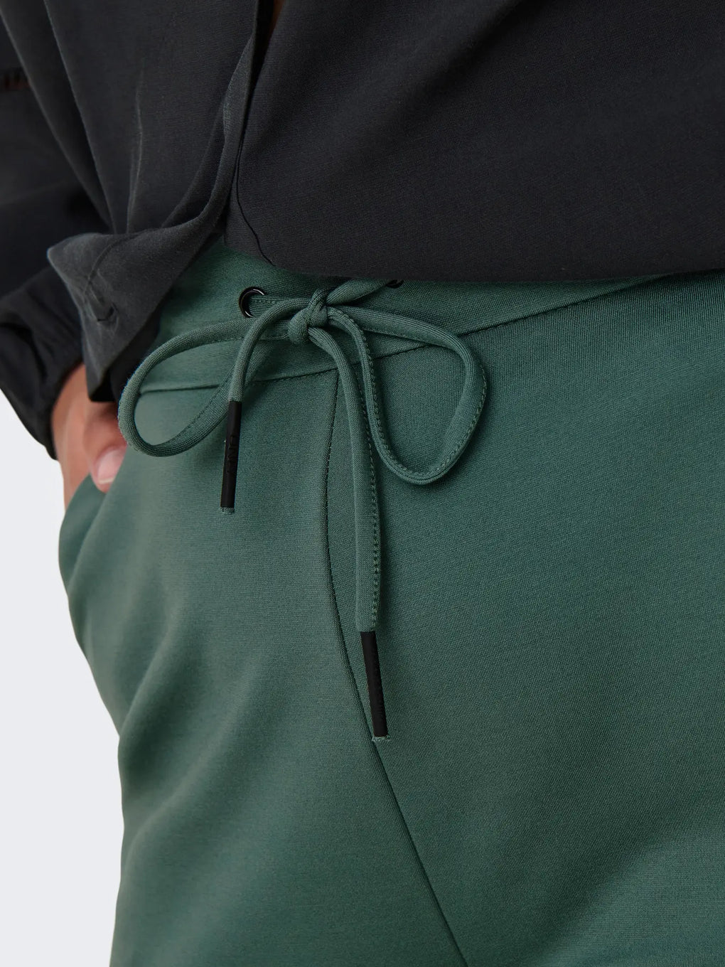 Supergod bukse i en fin farge. Den er smal på bena, strikk i livet med knytebelte.
