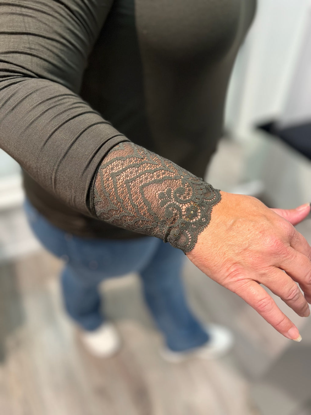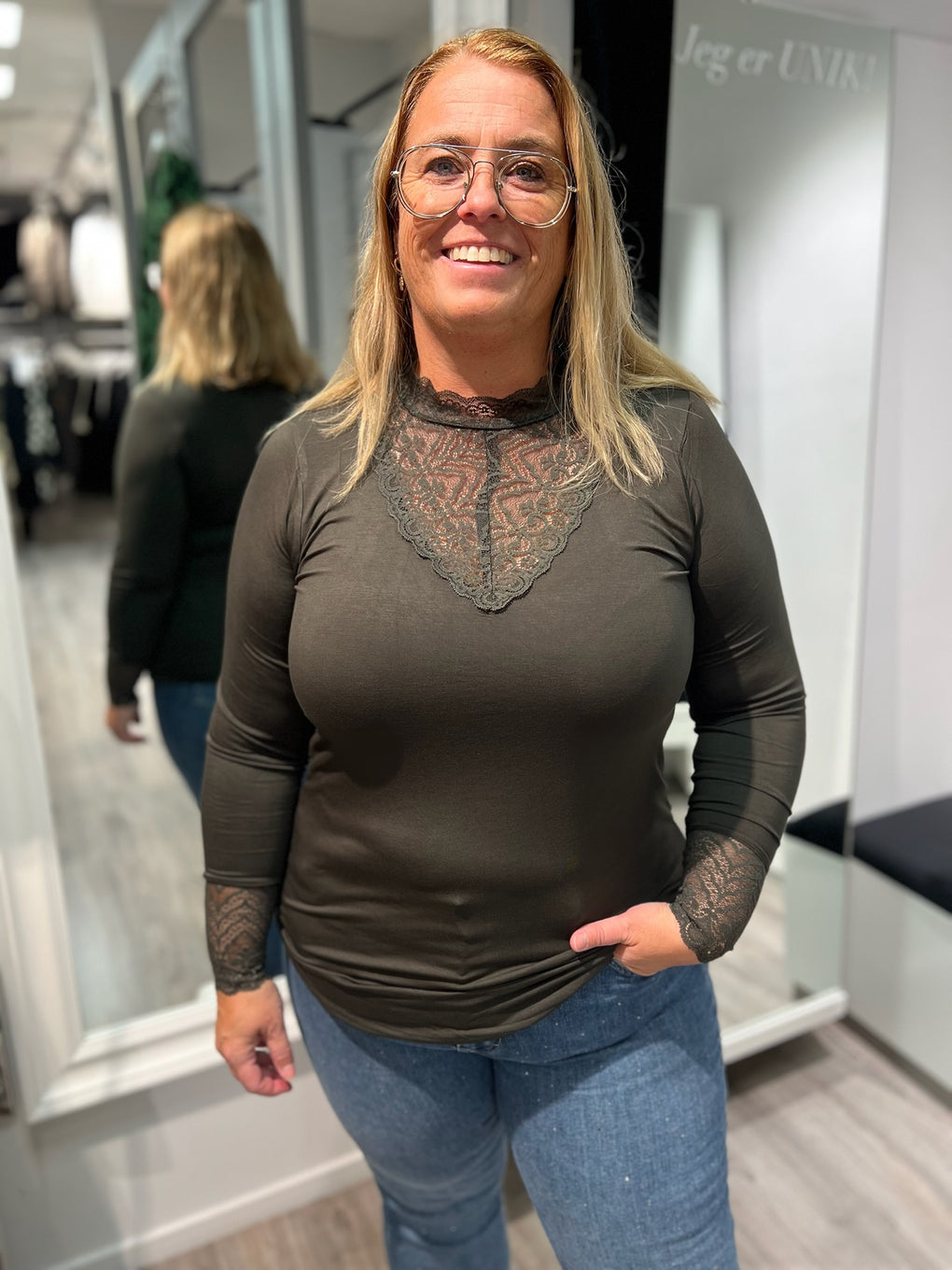 Supersøt genser i bambus med fine detaljer på halsen og på ermene.
