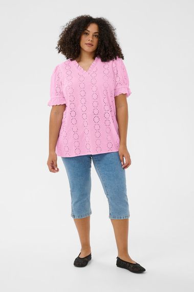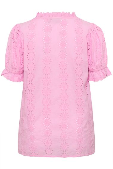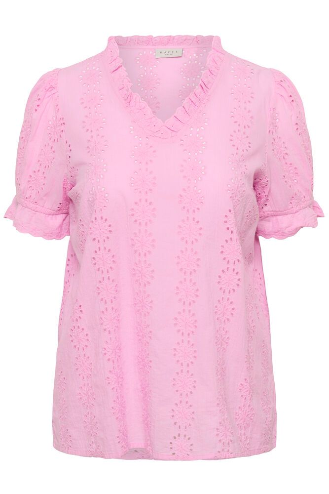 Supersøt blondebluse i en nydelig rosa farge. Blusen har korte ermer og v-hals med volangkant.