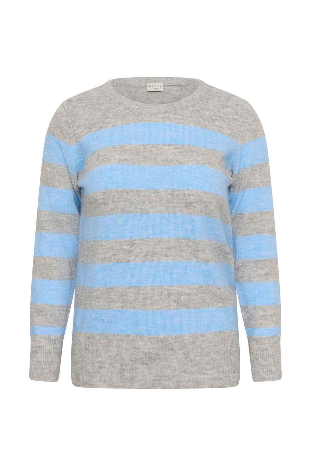 Denne stripete strikkegenseren har en rett passform og klassisk rund hals. Den har lange ermer og vanlig lengde, med synlig myk overflate.