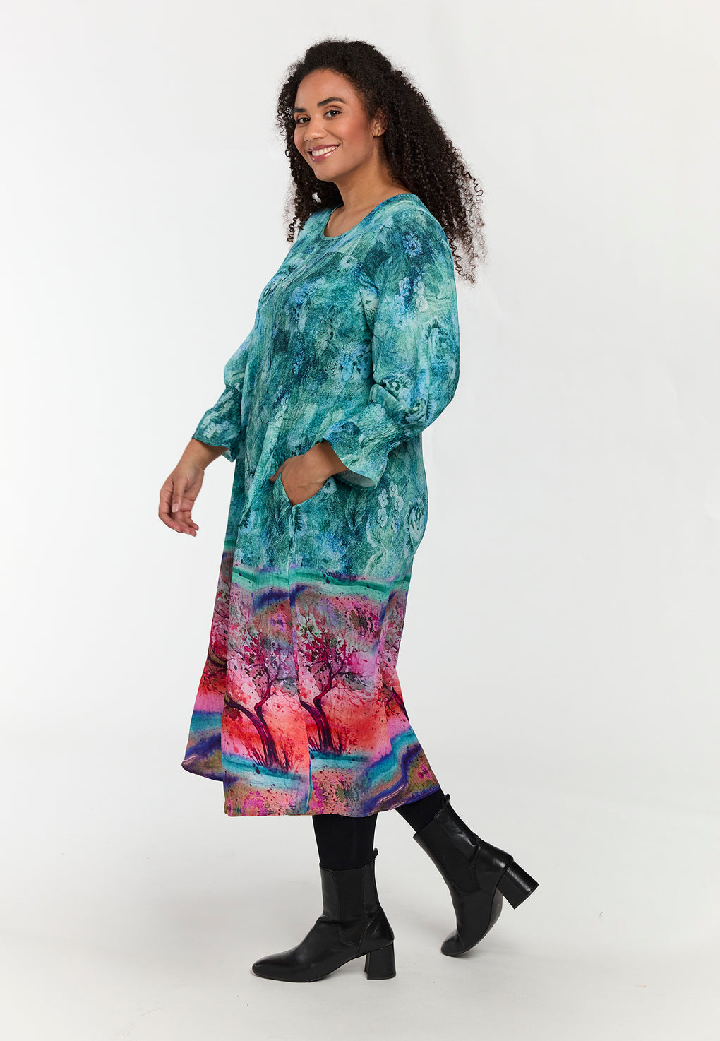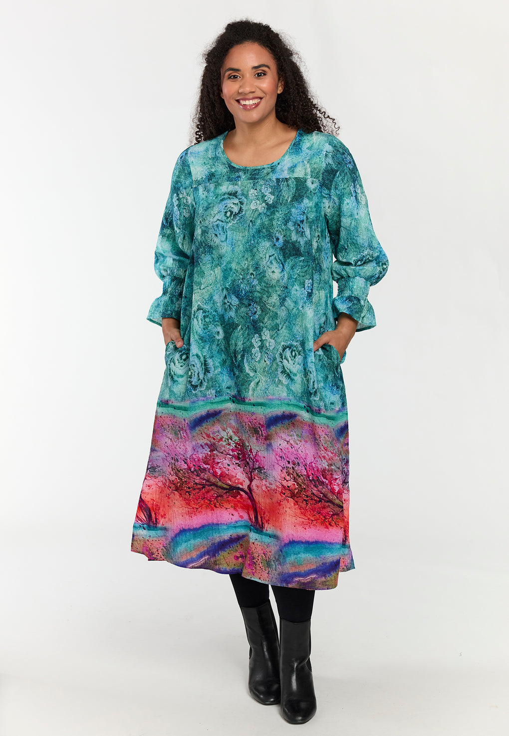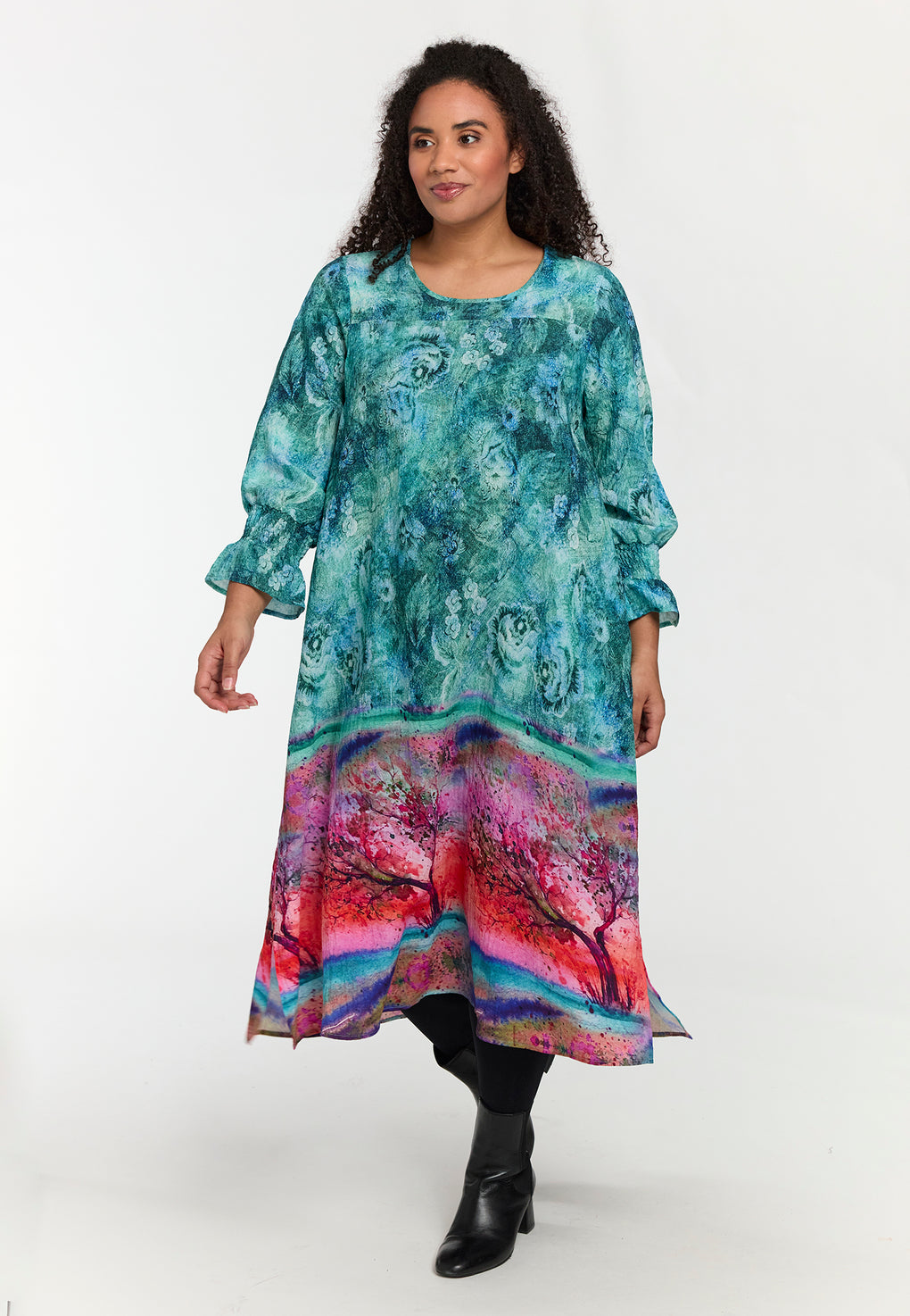 Supersøt kjole i ett nydelig blomsterprint. Dyp v-hals og lange ermer med strikk. V-halsen kan du evnt neste litt øverst om du synes den blir for vid 😉 Materialer 100% Viskose LENZING™ECOVERO™