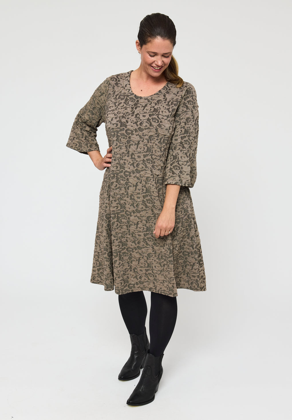 Supersøt kjole med rund hals og 3/4 ermer. Kjolen har en A-fasong og fin struktur i stoffet.