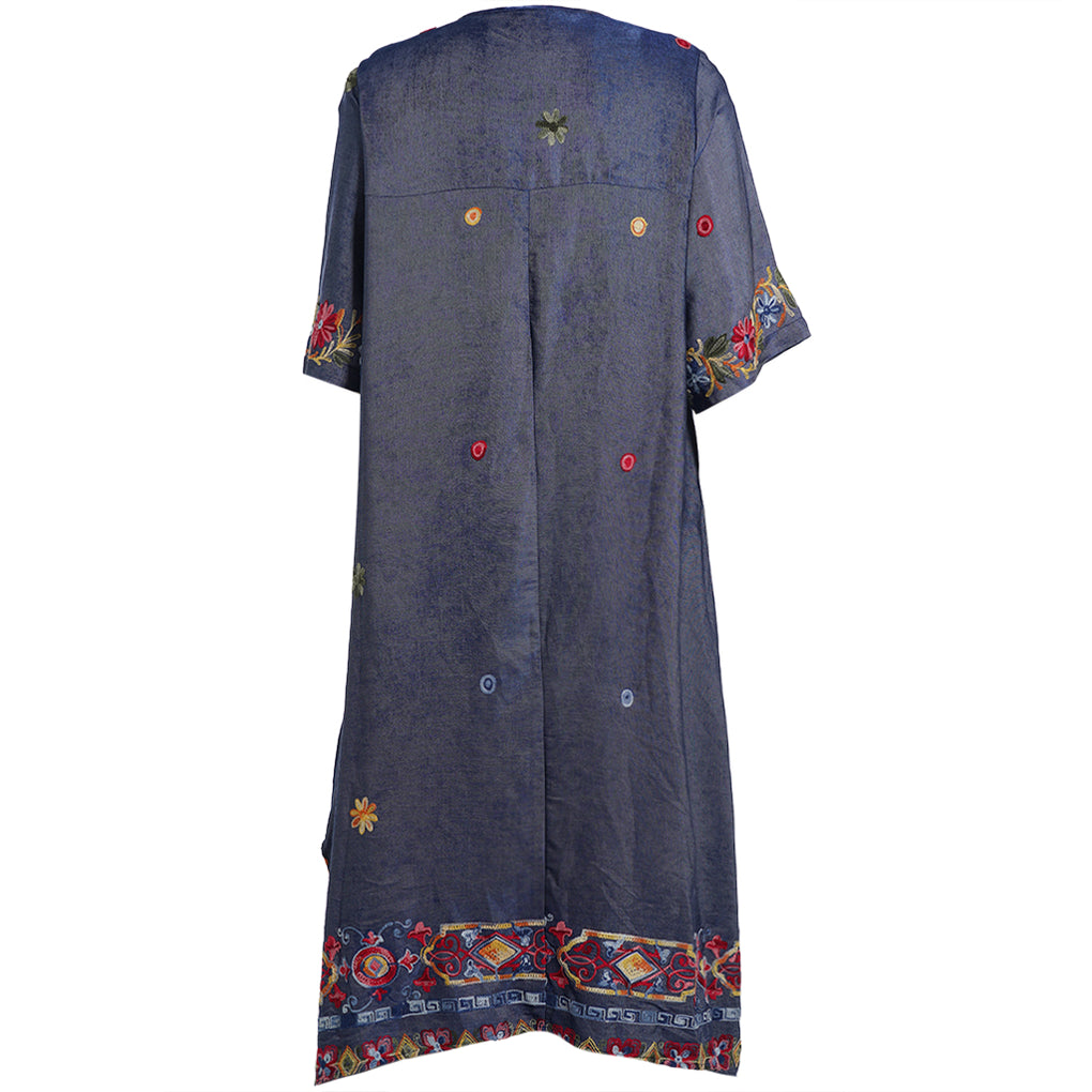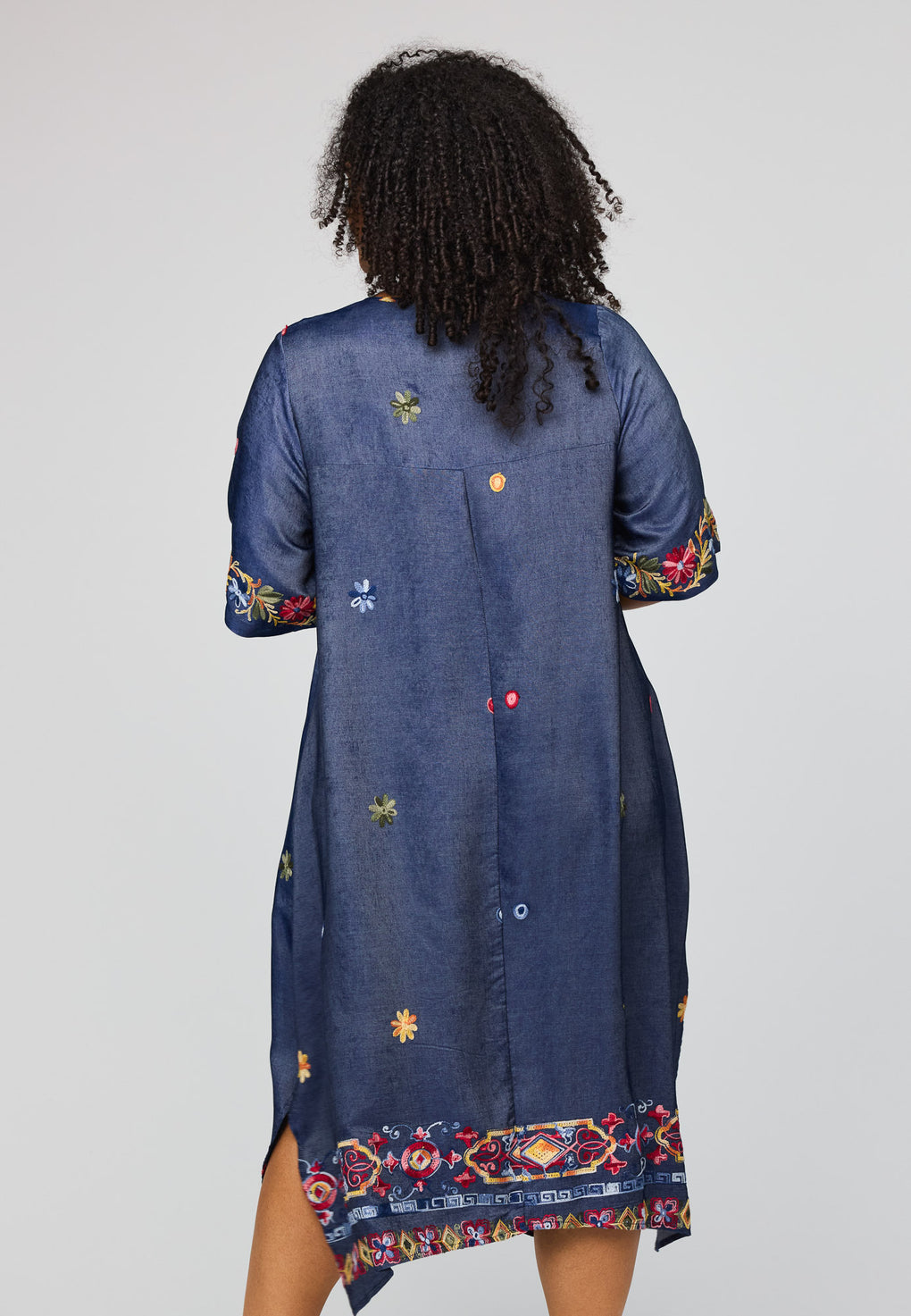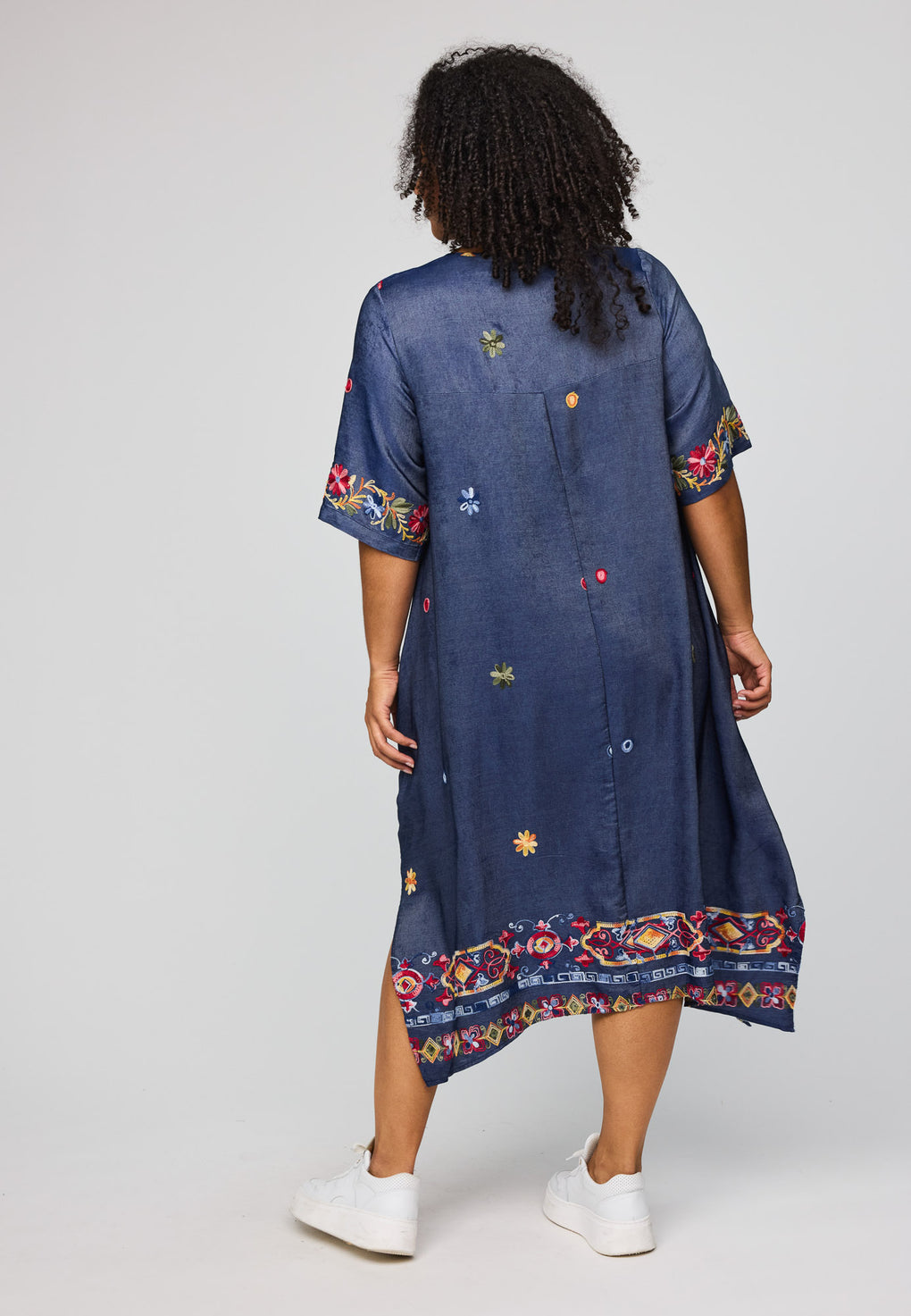 Lengden går til midt på leggen på de fleste, med fine sidesplitter som gjør stegene lette. En diskret glidelås lukker kjolen, og en liten legg foran gir ekstra bevegelse i fronten. Lommene i siden er akkurat der du vil ha dem, og broderidetaljene gir et rolig, håndverksaktig uttrykk uten at det blir pyntete.