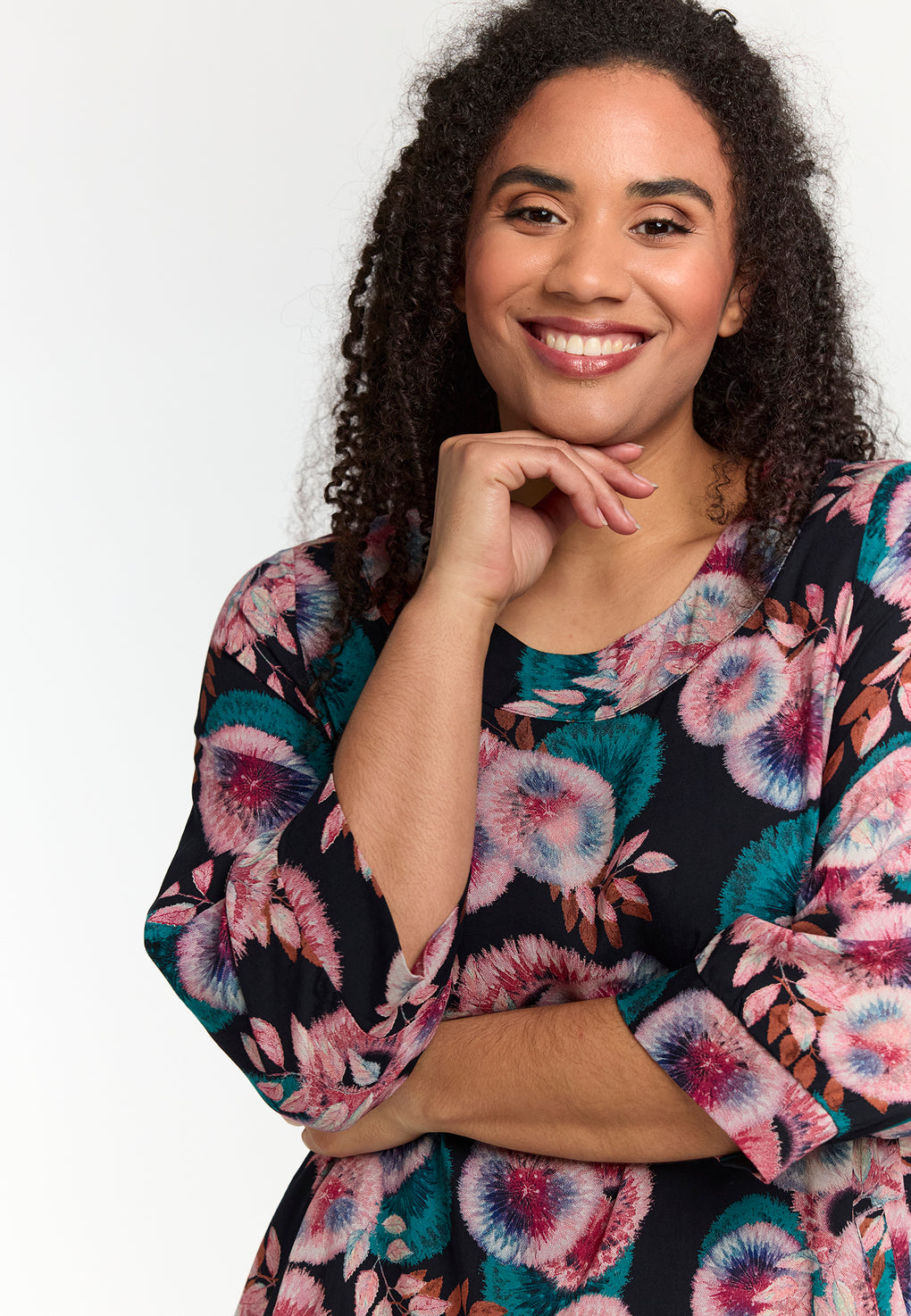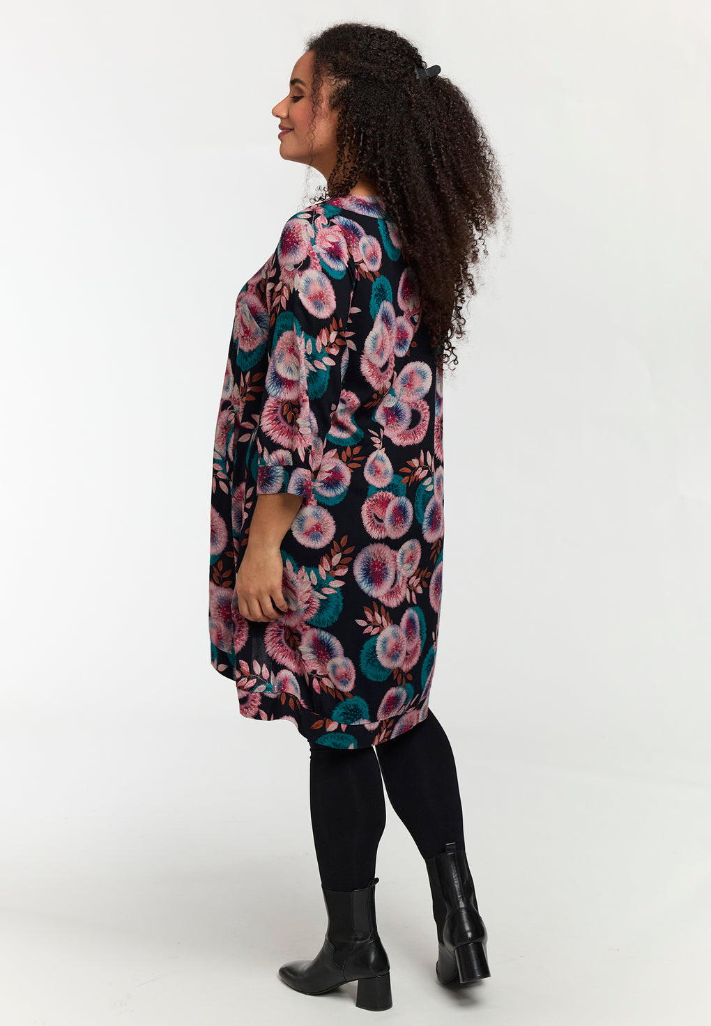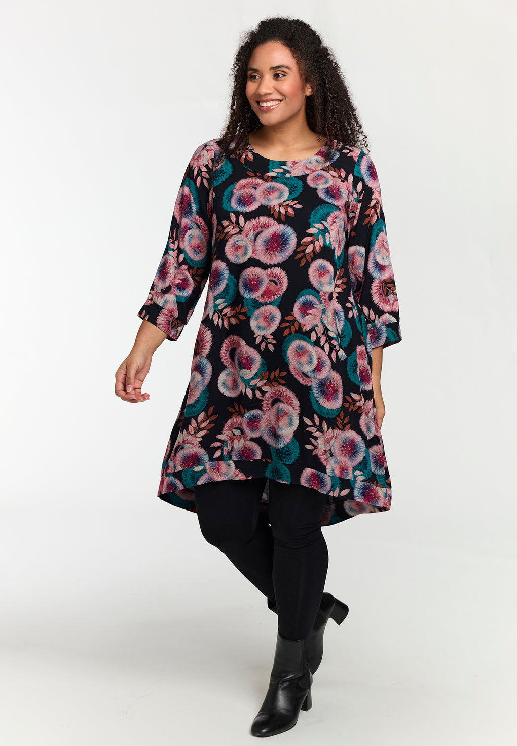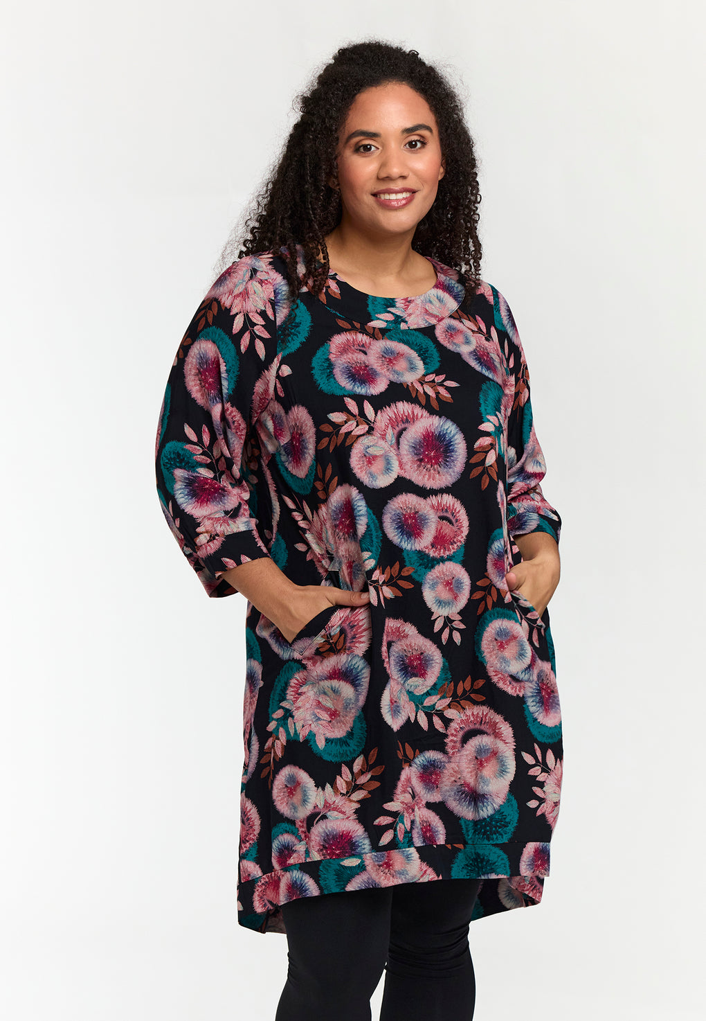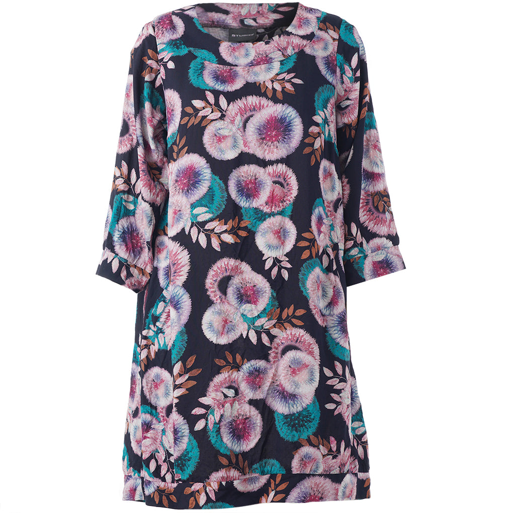 Supersøt tunika/kjole i ett romantisk print. Rund hals og 3/4 ermer med lommer på sidene.