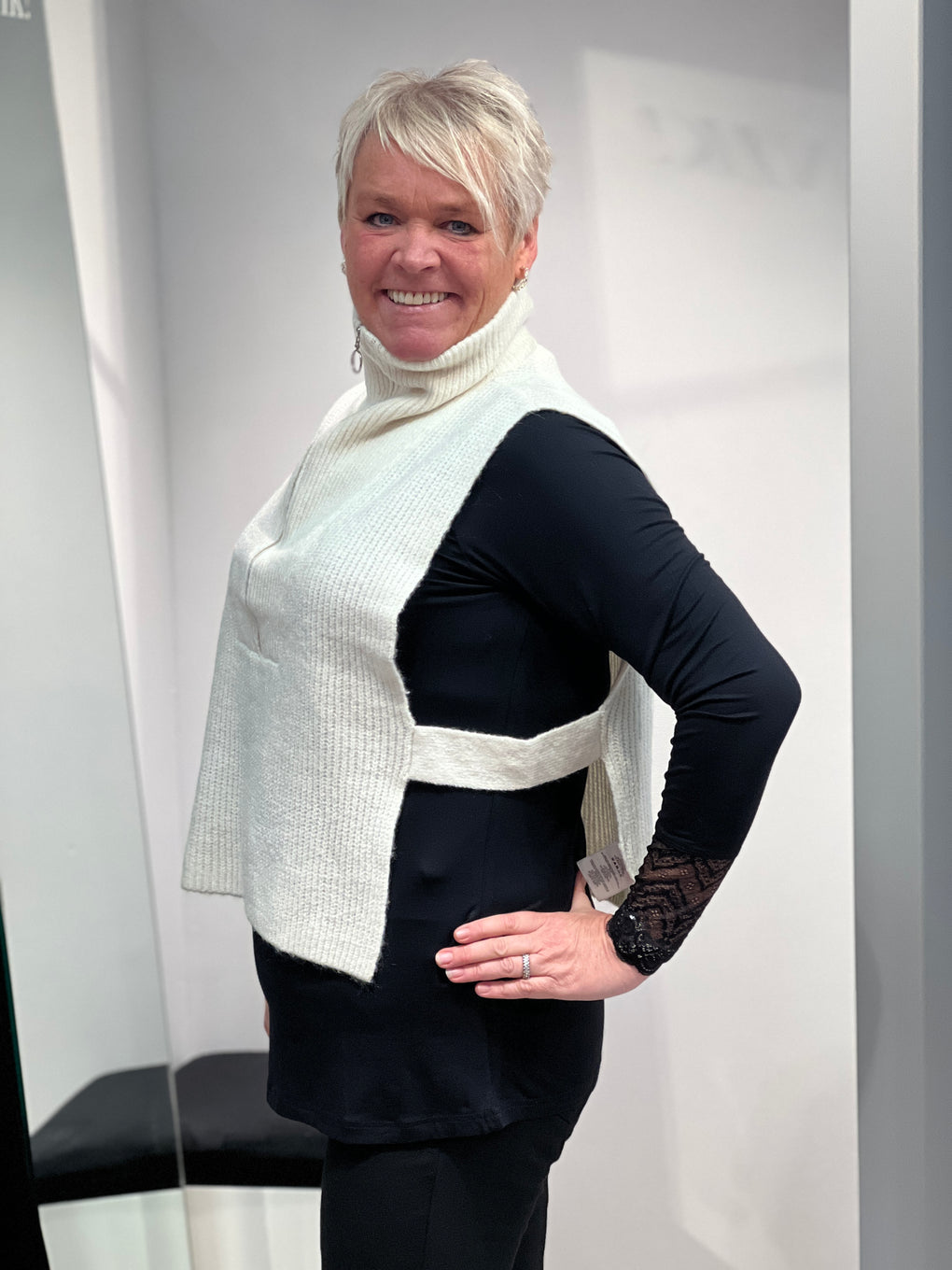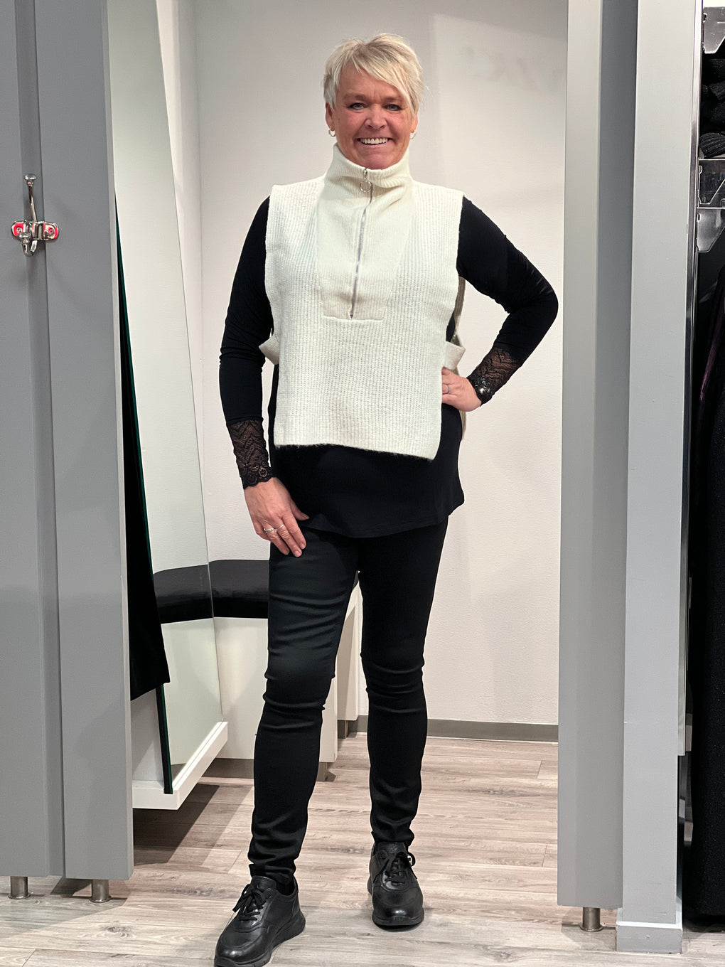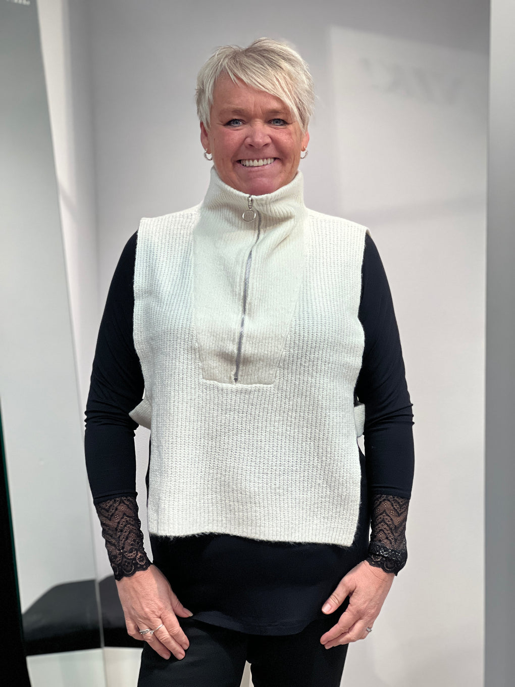 Fin strikket vest med glidelås. Den er fin å ha under en jakke for ekstra varme. Denne er i onesize og passer alle.